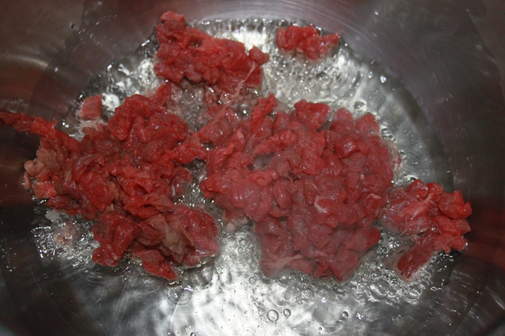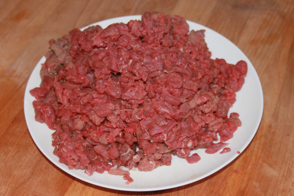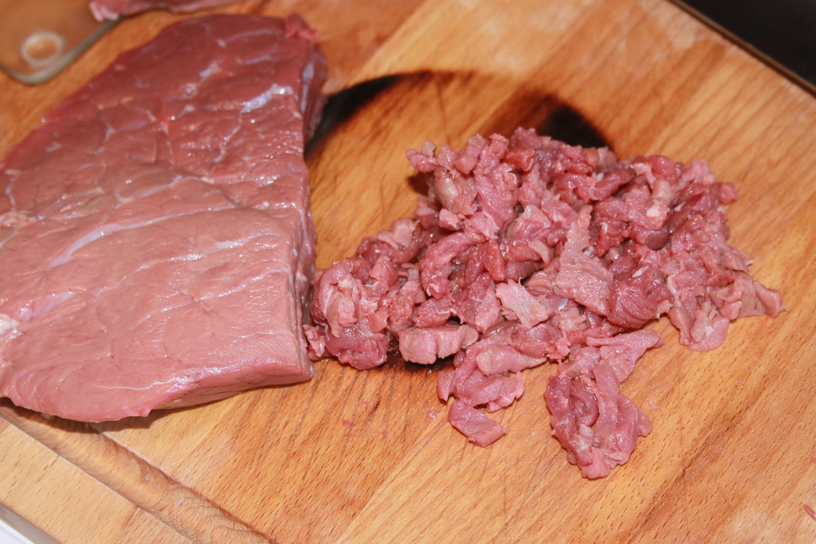 Puis en petits morceaux. Il ne faut pas mixer le boeuf. Il faut prendre son temps et couper de petits morceaux. Cela n’est pas difficile, ni long.