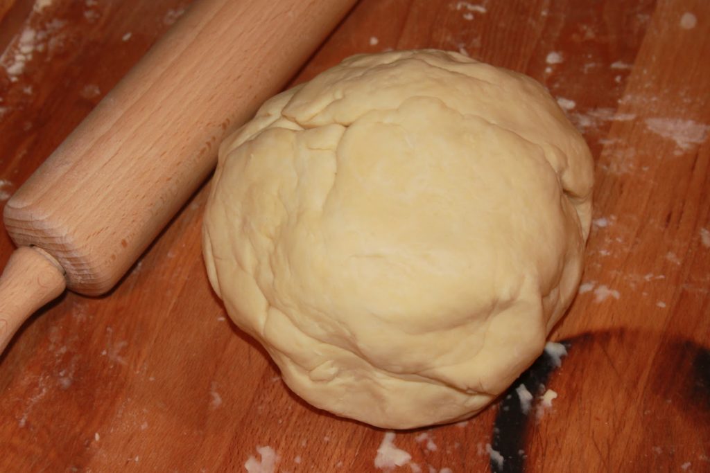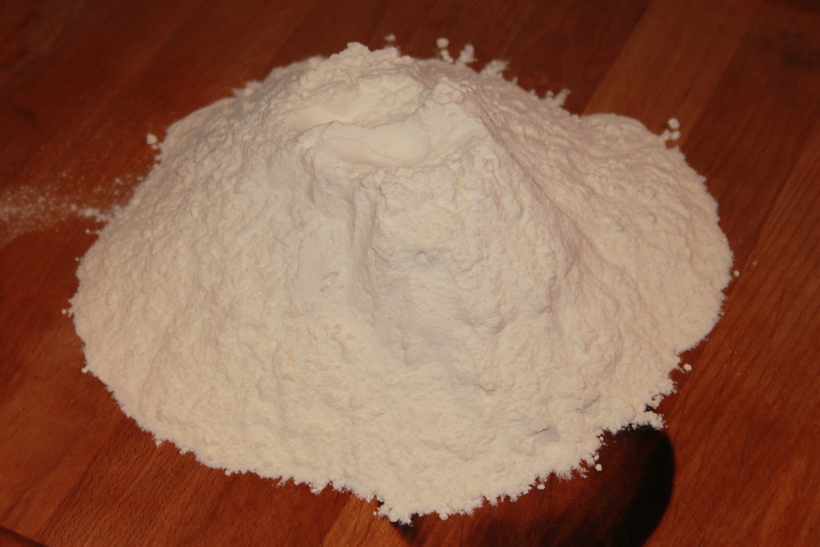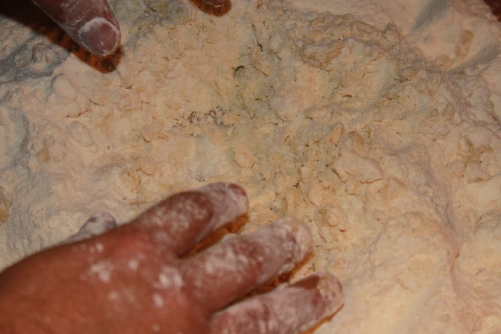 - Quand la farce est refroidie, il faut s’attaquer à la pâte. Mettre le kilo de farine sur le plan de travail.