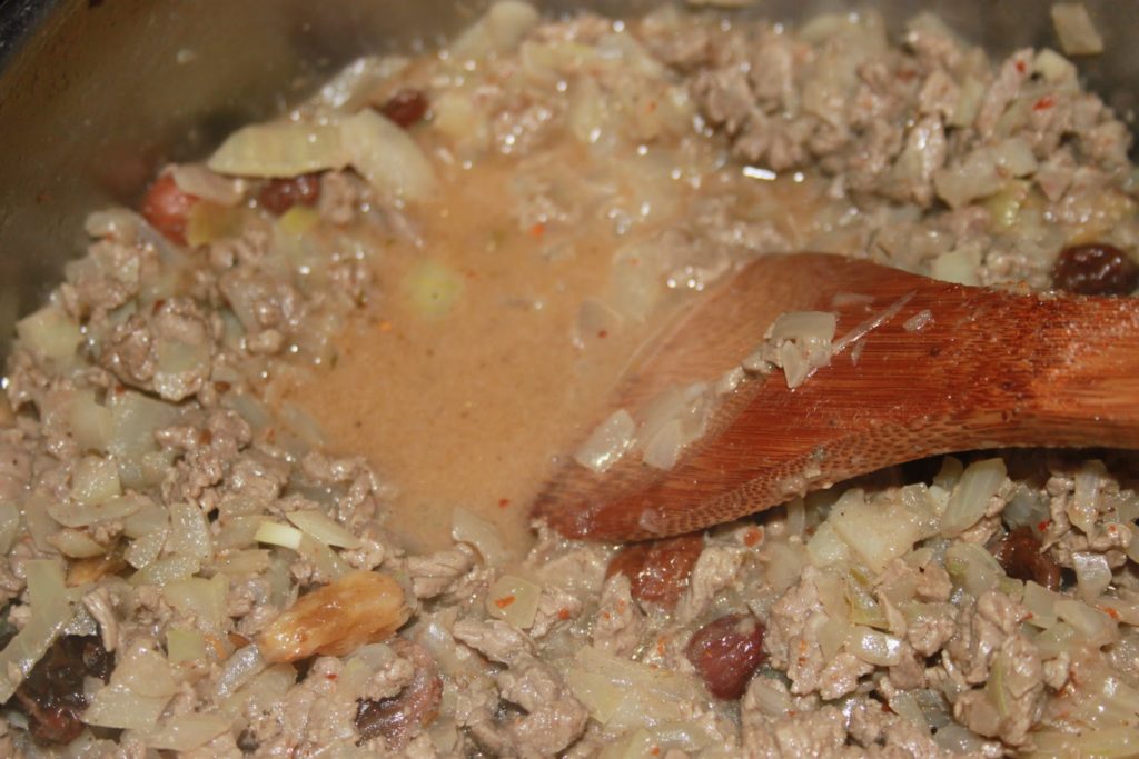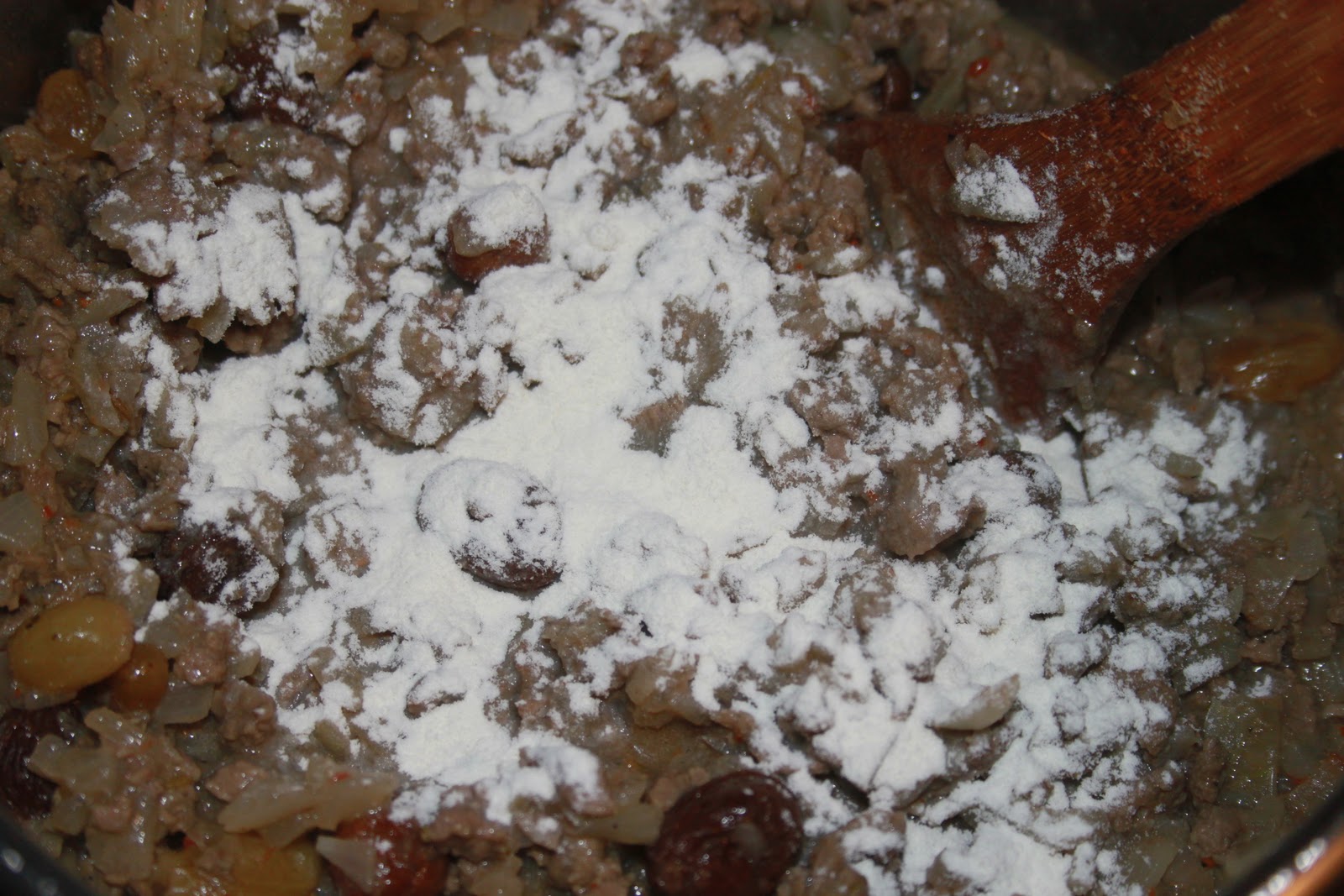 Laisser cuire jusqu’à ce que le boeuf et les oignons rendent du jus. Ajouter à ce moment l’origan et le cumin. Je vous laisse juges de la quantité à mettre. Il faudra ajuster les épices à la fin de la recette, avant de farcir les empanadas.