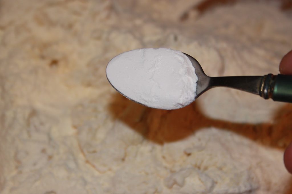 - Ajouter la cuillerée à café de levure chimique. Bien mélanger. Saler en saupoudrant légèrement de sel la pâte.