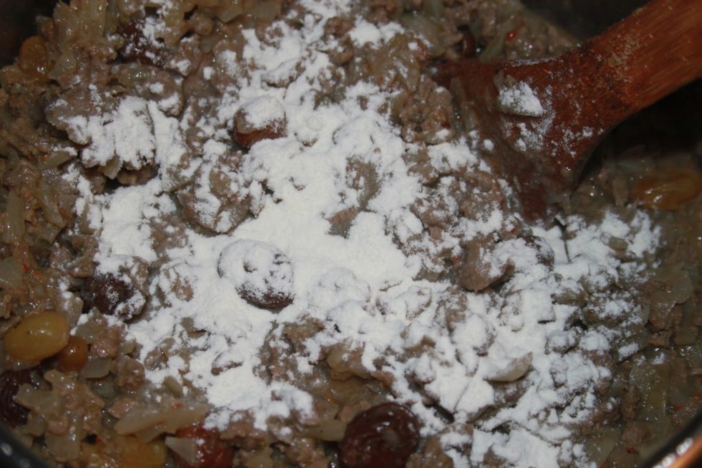 Ajouter un peu de farine (l’équivalent d’une cuillerée à soupe rase) en saupoudrant le dessus de la farce.