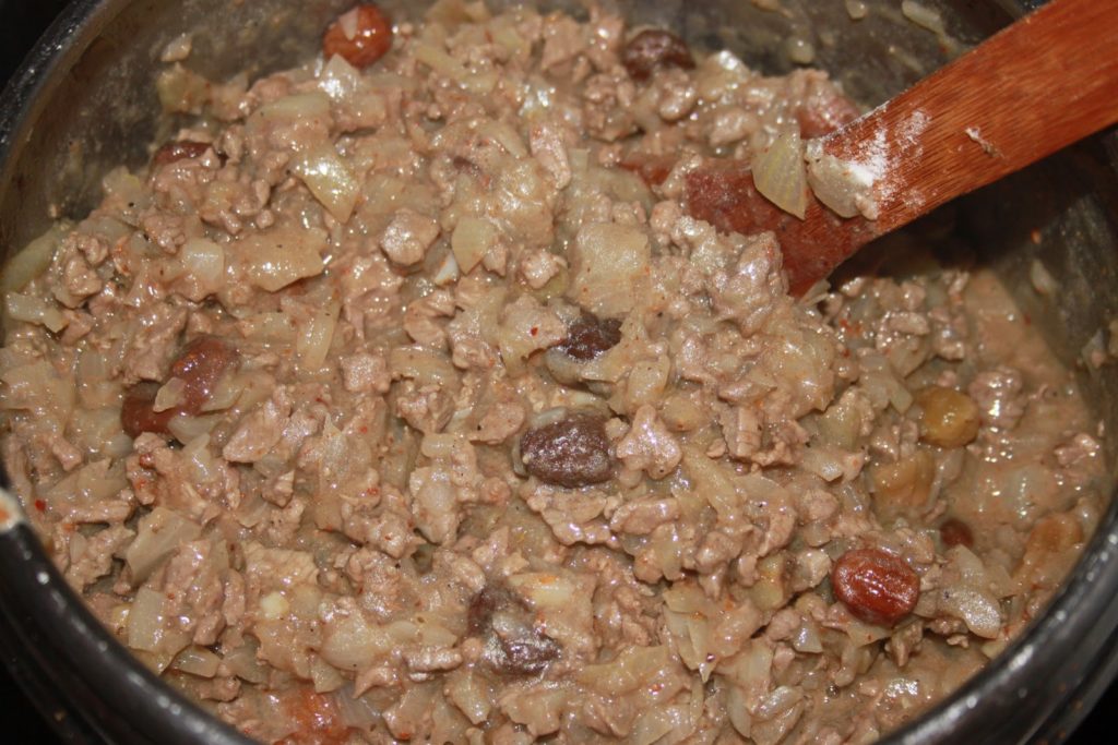 - Mélanger et laisser mijoter un peu plus. La farce doit être moelleuse avec juste ce qu’il faut de sauce épaissie. Goûter pour ajuster le sel et les épices. Laisser complètement refroidir.