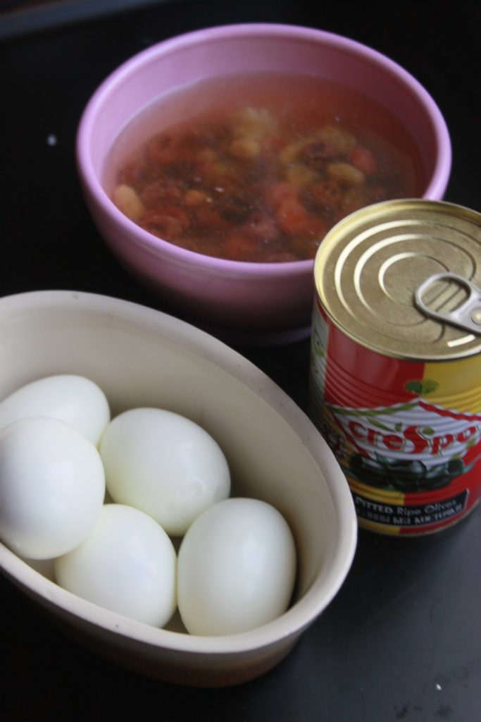 - Préparer les ingrédients. Laisser gonfler les raisins secs dans un bol d’eau tiède, cuire les oeufs durs et les éplucher.