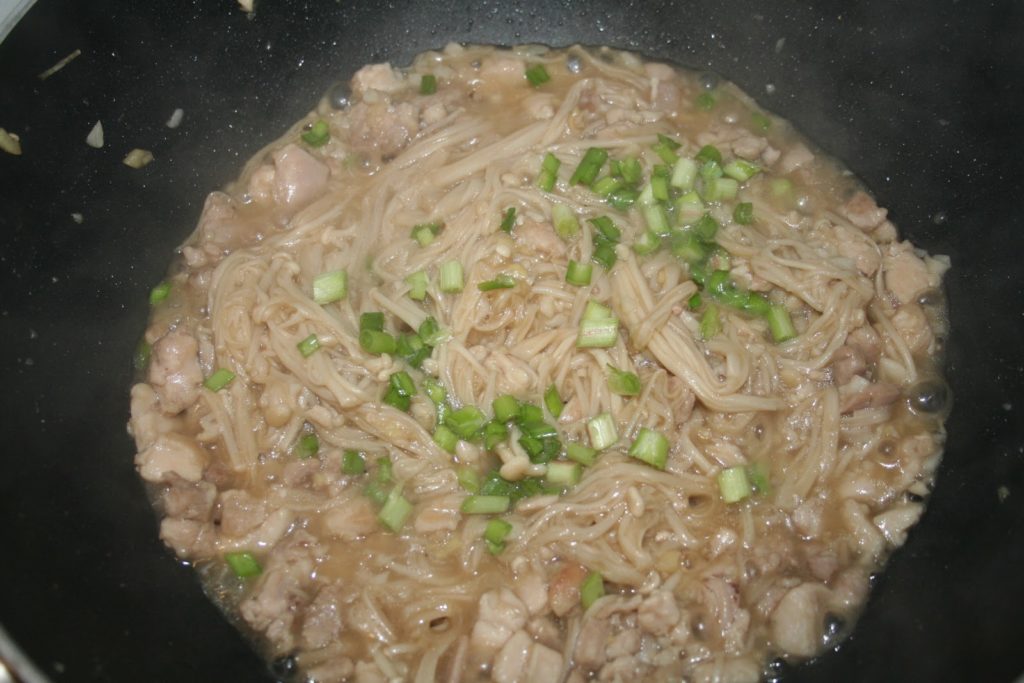 Quand l’ail et le gingembre commence à colorer, ajouter les enokis.