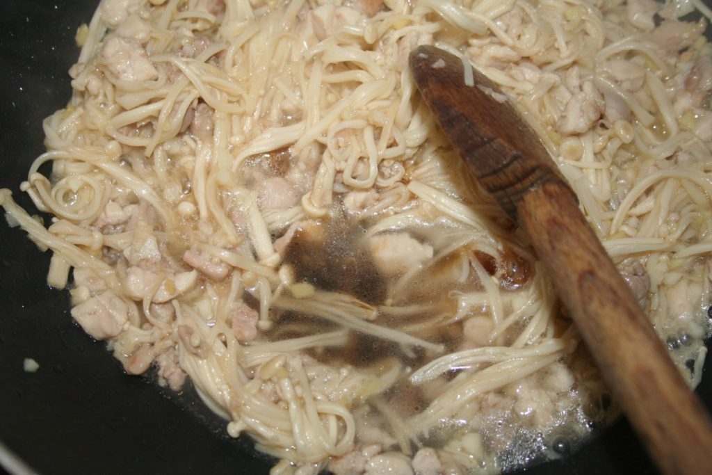- Quand l'ail et le gingembre commence à colorer, ajouter les enokis.