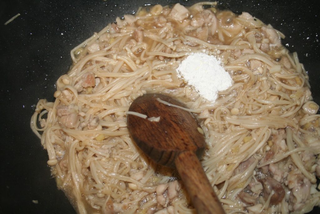 - Quand les enokis deviennent mous (3-4 minutes), ajouter l'eau, le sucre et la sauce de soja.