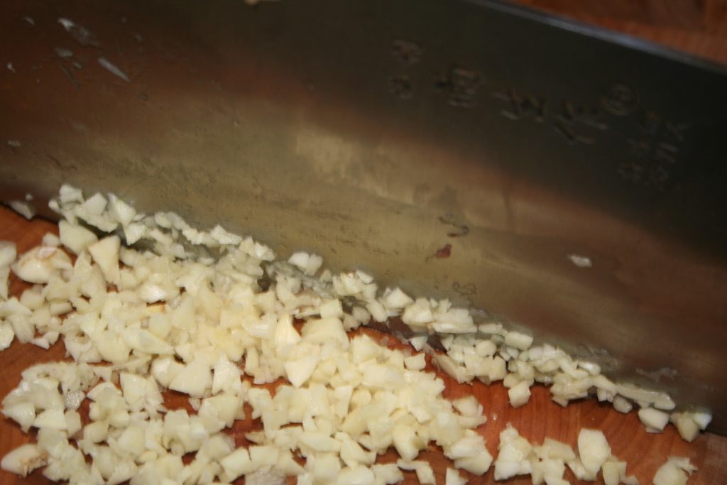 Hacher finement les gousses d’ail et le gingembre. J’ai mis dans la recette 6 gousses d’ail, mais le goût n’est pas aussi prononcé que l’on pourrait le penser. On peut en mettre une en plus ou en moins, mais je pense sincèrement que 6 est un bon chiffre!