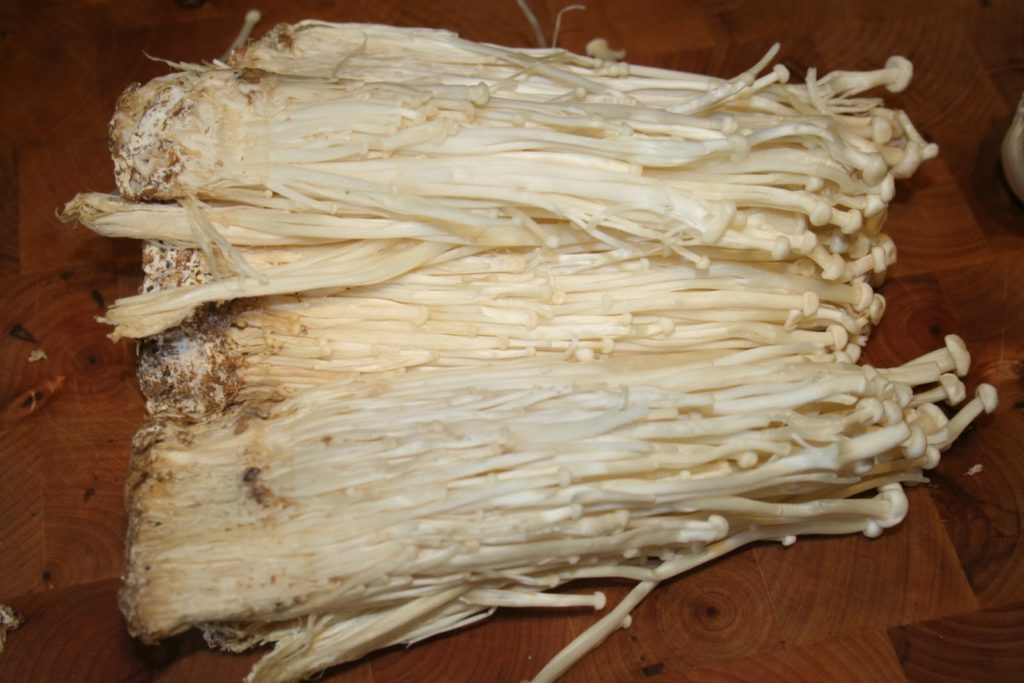Voici les »enokis »… C’est très facile de les trouver dans les épiceries asiatiques. Pour ma part, je les ai achetés che Paris Store dans le 13ème. De plus, ils ne sont pas chers du tout! Aux alentours de 5€ le kilo (novembre 2010).