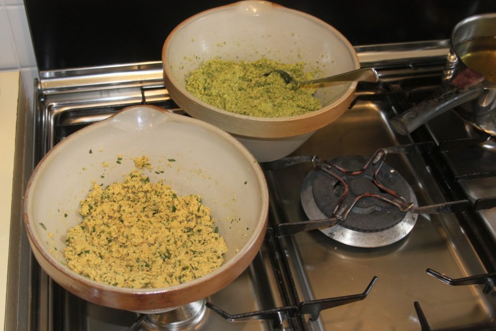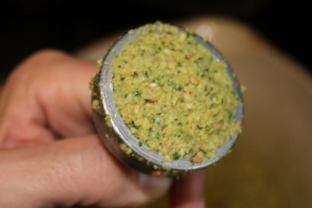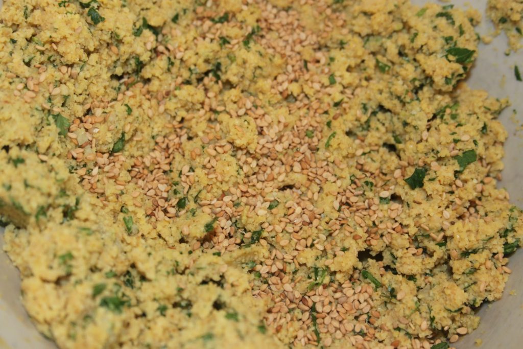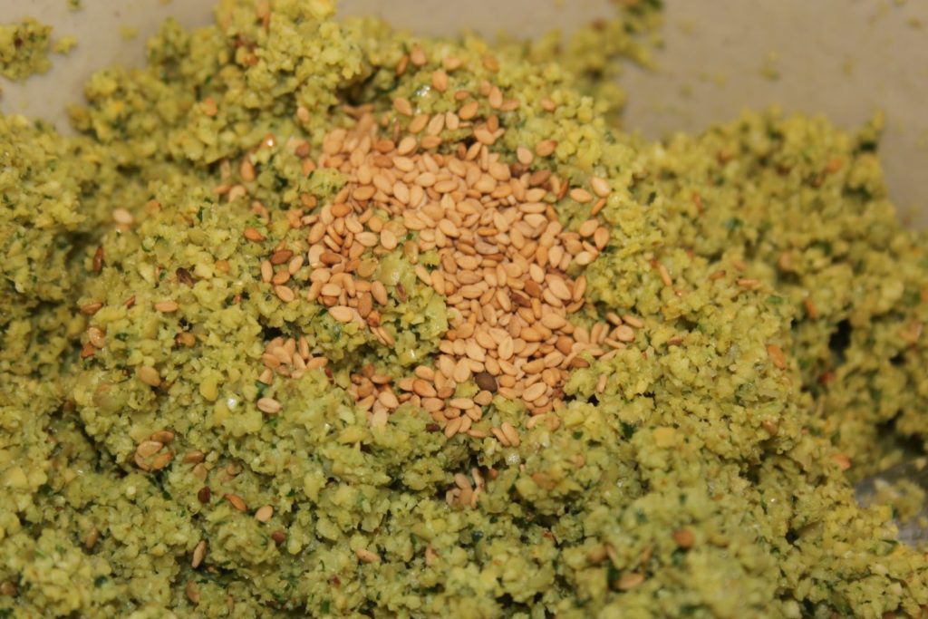 - Bien mélanger et ajouter (c’est délicieux avec!!) les graines de sésame grillées. On obtient donc une pâte où l’on voit les herbes.