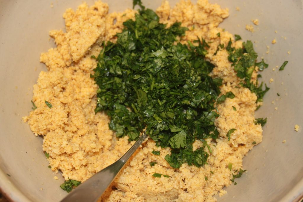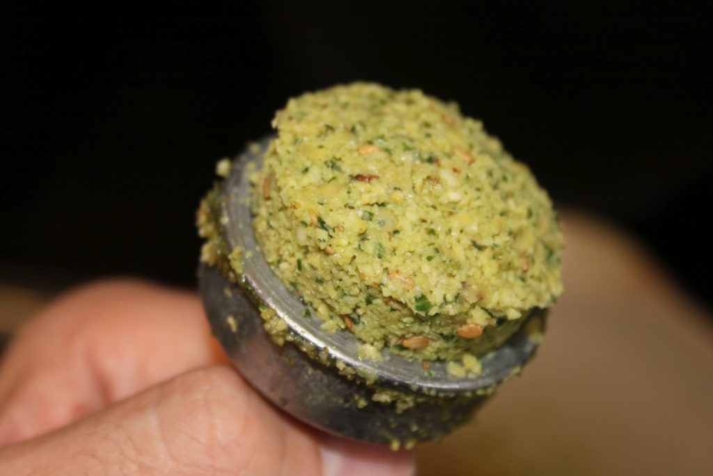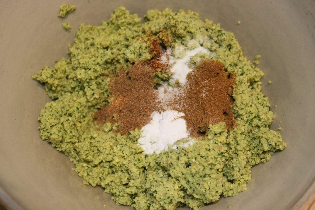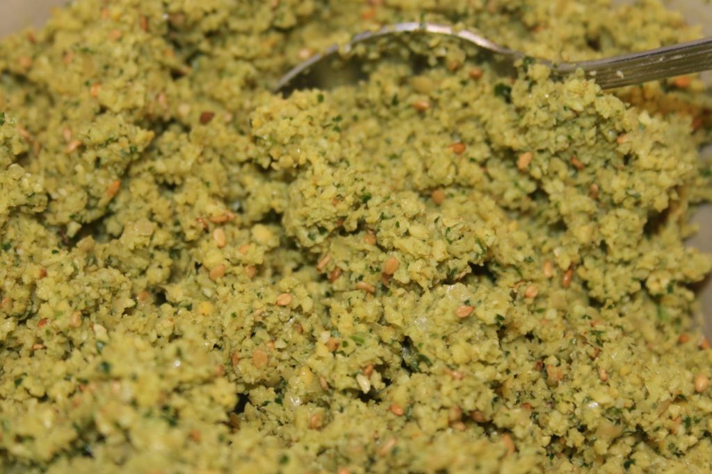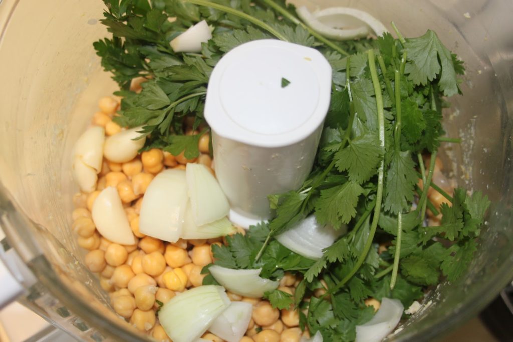 Une autre solution qui donnera une pâte verte (au goût, c’est quasiment la même chose!) consiste à tout mettre ensemble dans le mixeur. J’aime cette version car du coup ça va plus vite et cela donne une belle couleur de falafels.