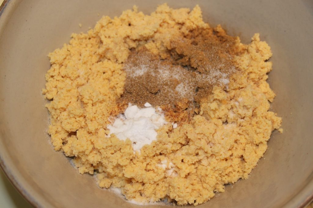 - Mettre la pâte dans un bol puis ajouter les épices: coriandre en poudre, cumin, piment, sel, bicarbonate de soude.