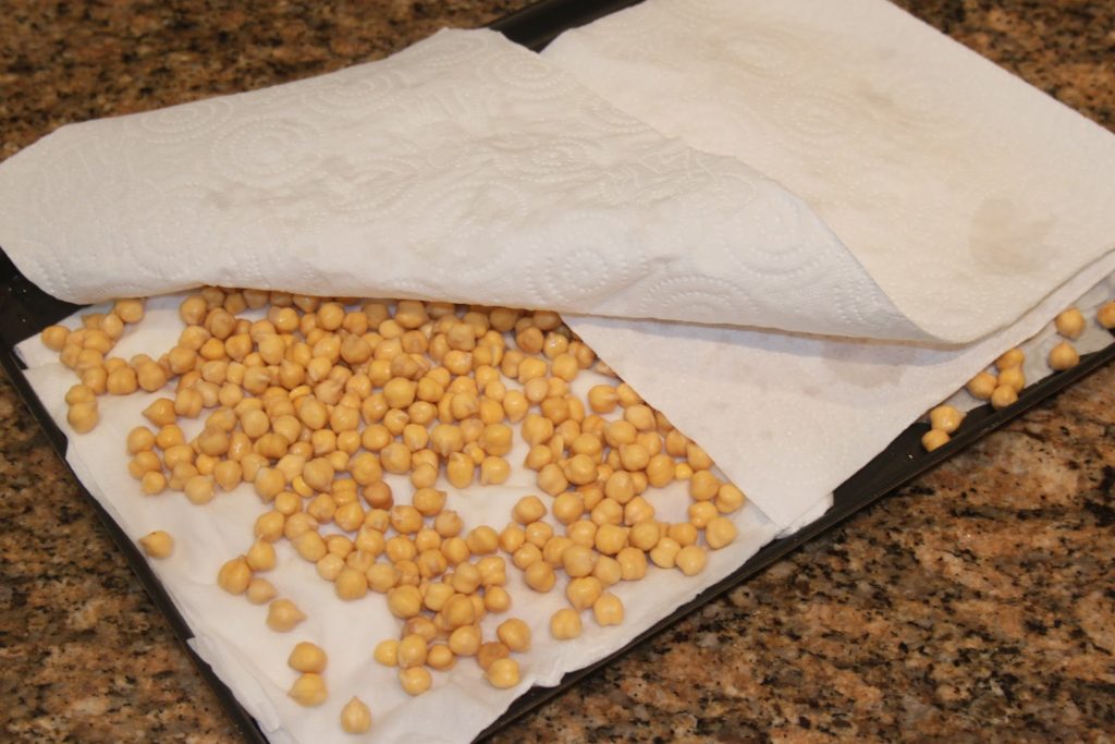- Vingt-quatre heures plus tard: bien égoutter les pois chiches puis les essuyer parfaitement dans un linge propre ou du papier absorbant. Il faut vraiment que les pois chiches soient secs. Car c’est souvent là que les falafels se délitent à la cuisson, car ils ont trop d’eau. Si on prend bien soin de les sécher, alors les falafels seront parfaits!