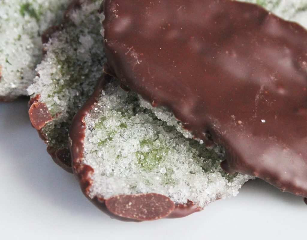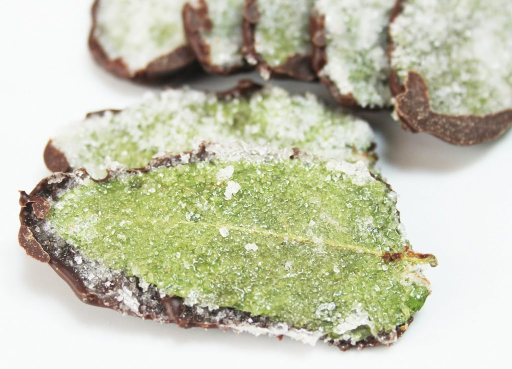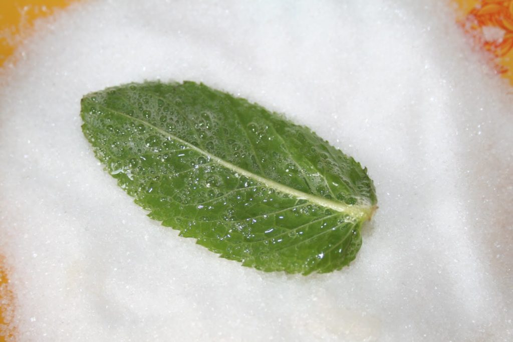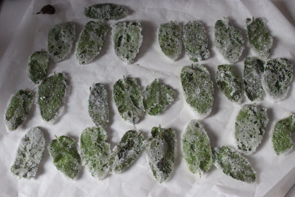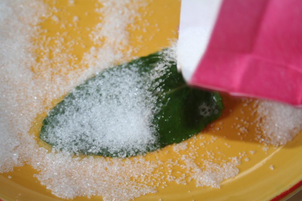 - Puis passer les feuilles de menthe dans le sucre. Conseil de Bernard: on peut choisir entre sucre semoule ou sucre cristal. J’aime le sucre cristal car il est plus craquant, mais il se peut que ce soit un peu trop sucré pour certaines personnes. Dans ce cas, on peut choisir de mettre du sucre semoule plus fin!