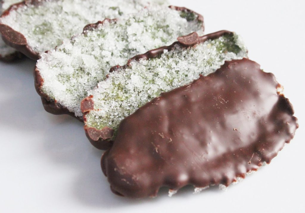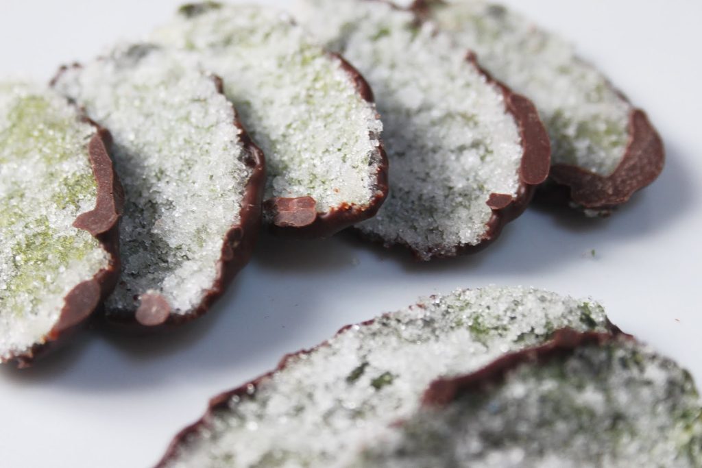 Voici les feuilles de menthe cristallisées au chocolat. Elles craquent, elles croquent, elles croustillent! Avec un chocolat parfaitement tempéré, la menthe est une alliée redoutable! Une petite recette simplement délicieuse, que j’avais découverte grâce à ma bonne amie Annick, qui devait m’en offrir un paquet, mais qui avait tout mangé avant de pouvoir me le remettre en mains-propres!