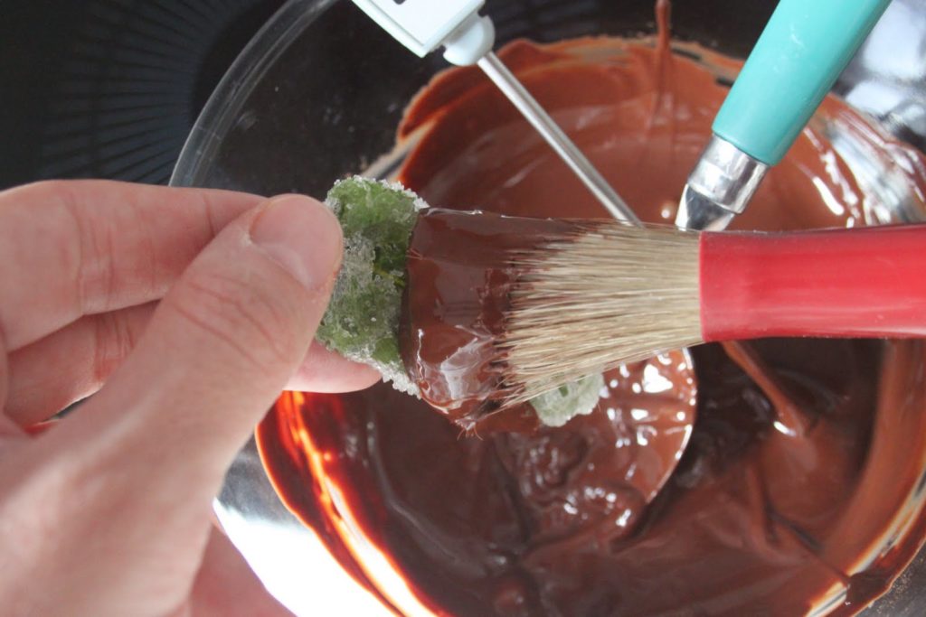 Pour une trentaine de feuilles de menthe, il suffit de 150 à 200g de couverture tempérée. Passer une couche de chocolat au pinceau sur la face la moins jolie (le dessous des feuilles).
