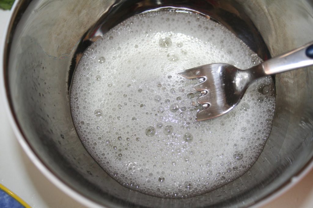 Il faut battre légèrement le blanc (on ne veut pas des blancs montés en neige!!), juste pour « casser » sa consistance, pour le rendre plus liquide.