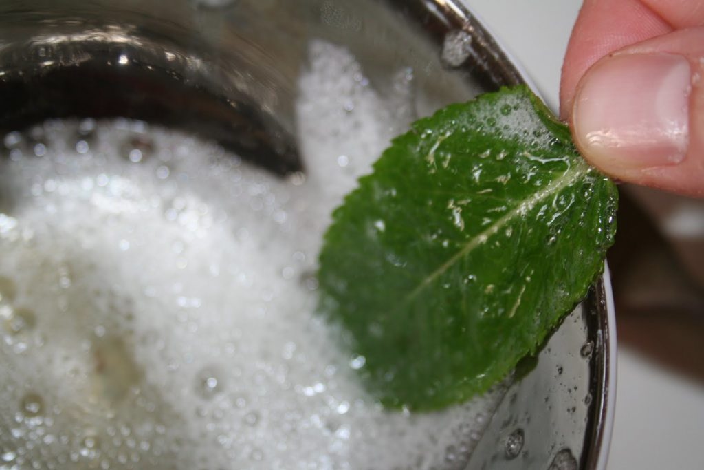- Tremper les feuilles de menthe, des deux côtés dans le blanc. On peut aussi passer un pinceau trempé dans le blanc, sur les feuilles. Si l’on trempe les feuilles, il faut bien enlever l’excédent de blanc avec les doigts!