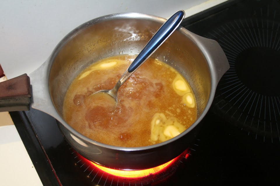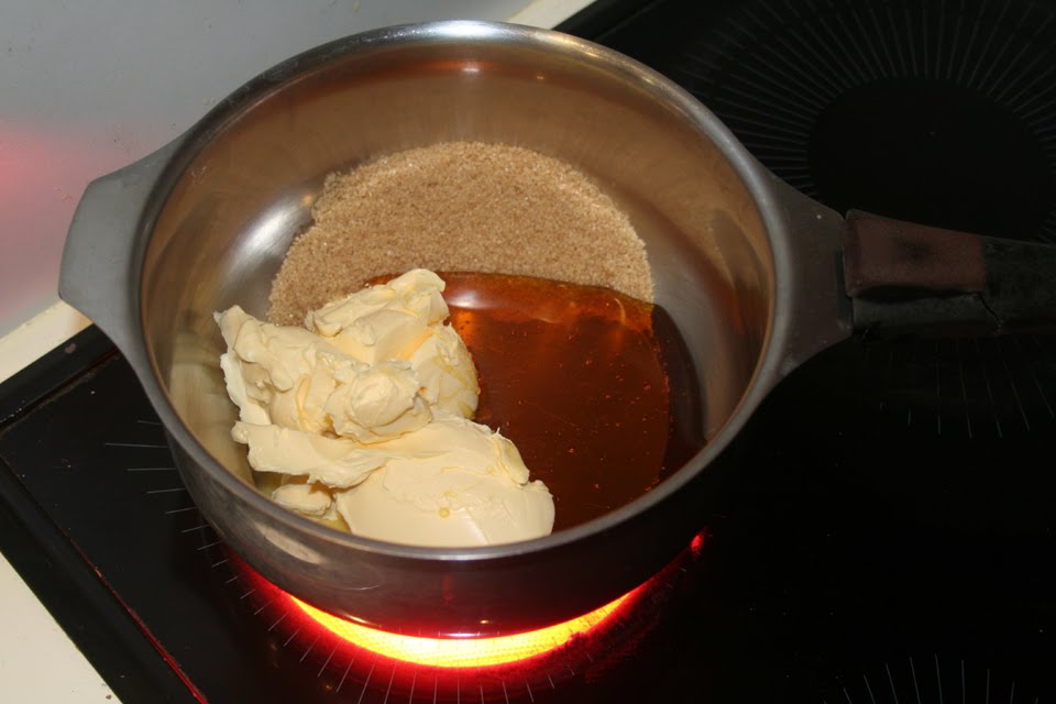 - Faire fondre sur feu doux dans une casserole, la margarine avec le sucre roux et le sirop.