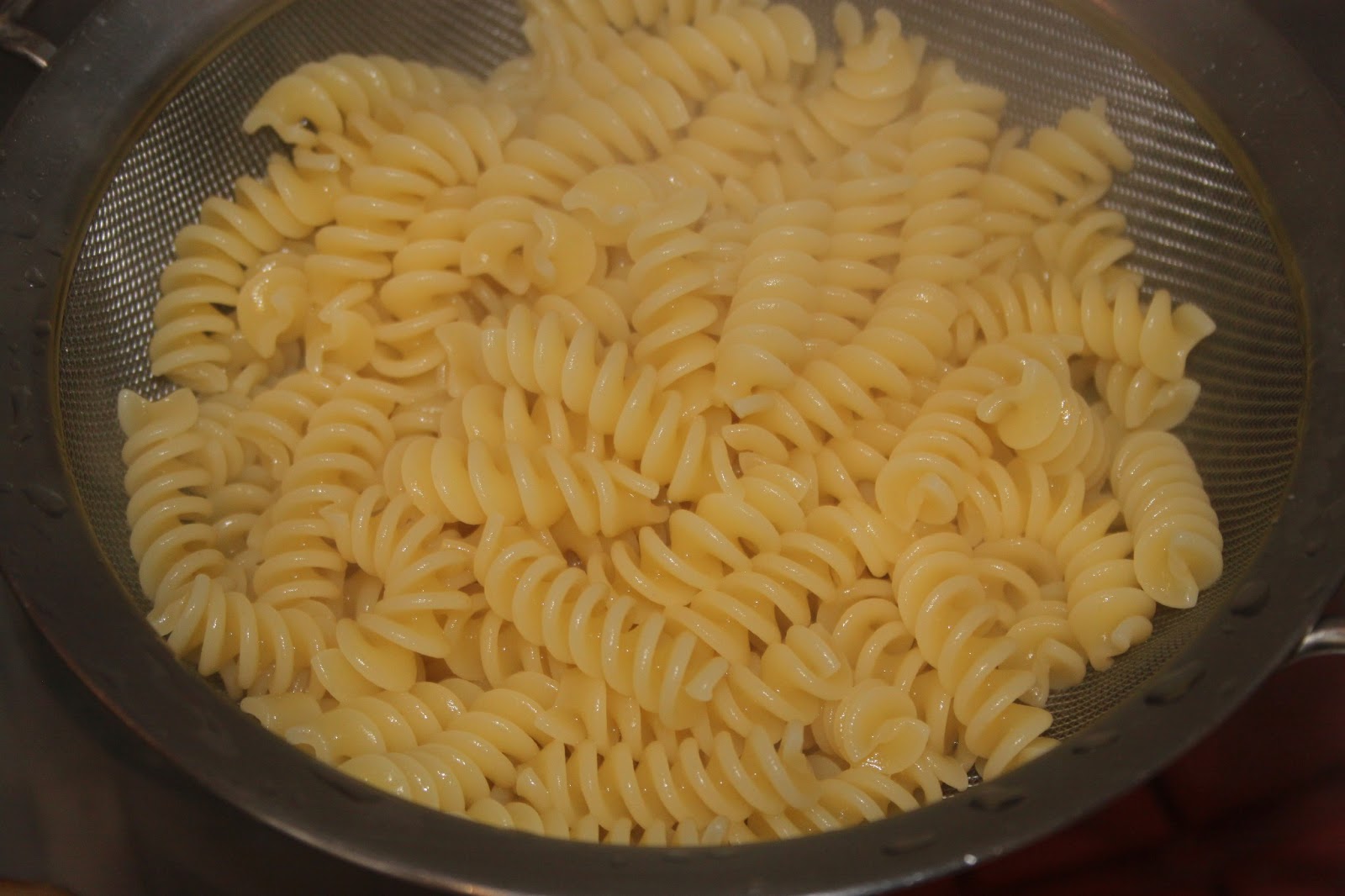 Pendant ce temp, cuire les pâtes fusilli en enlevant 1 minute de cuisson par rapport au résultat souhaité. Je les aime « al dente », j’ai donc enlevé une minute par rapport au temps « al dente » du paquet..