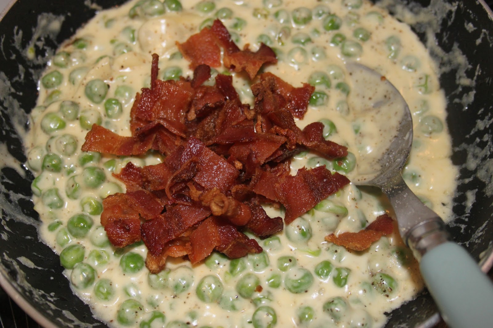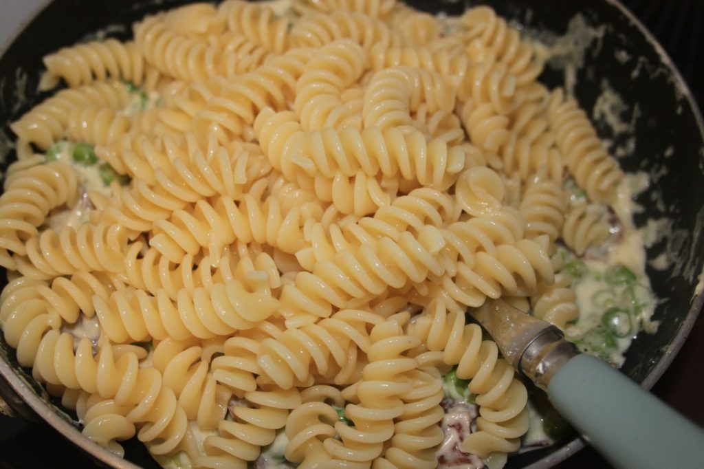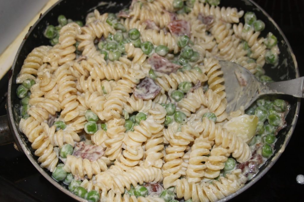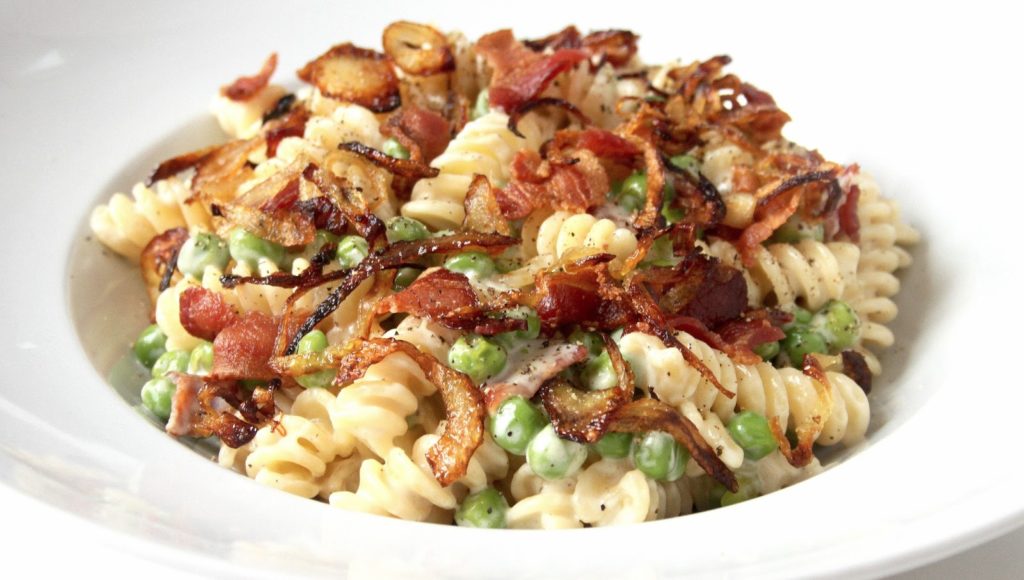 Pâtes aux Petits Pois, Bacon et Oignons Croustillants