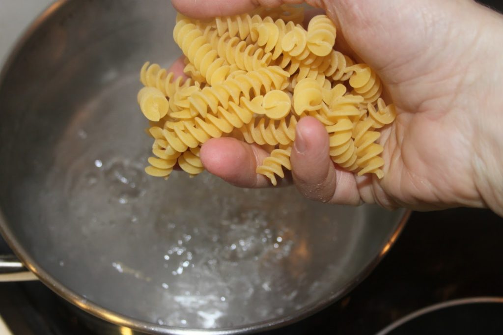 - Pendant ce temp, cuire les pâtes fusilli en enlevant 1 minute de cuisson par rapport au résultat souhaité. Je les aime « al dente », j’ai donc enlevé une minute par rapport au temps « al dente » du paquet..