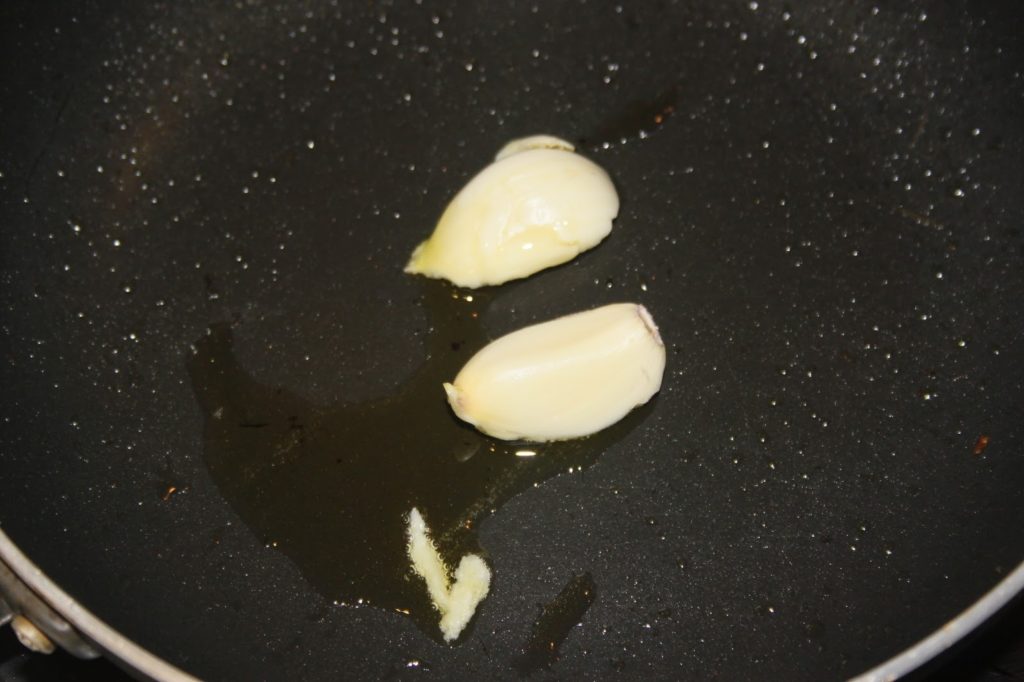 - Pour les pâtes: mettre l’huile d’olive dans une poêle avec les gousses d’ail entières. On peut les écraser, mais je les aime bien aussi entières!