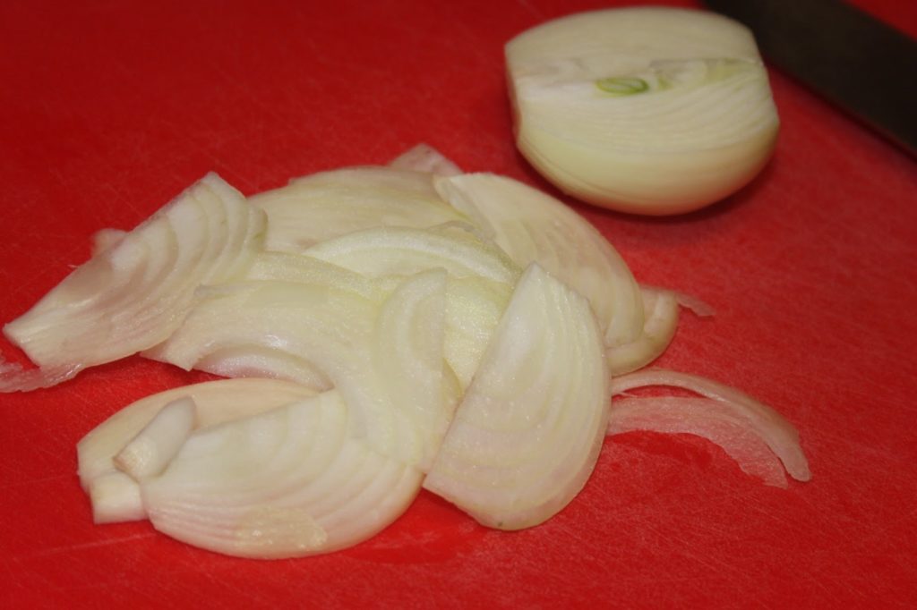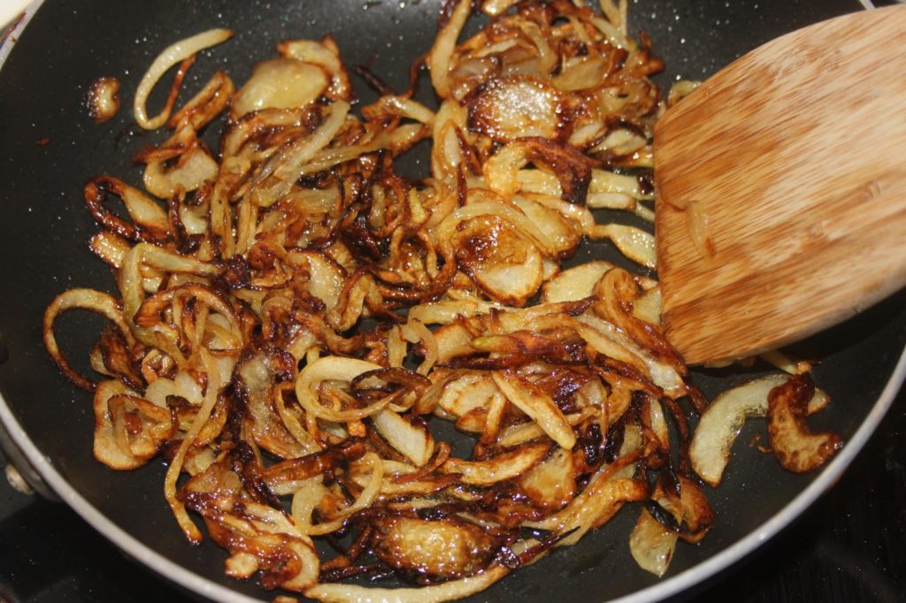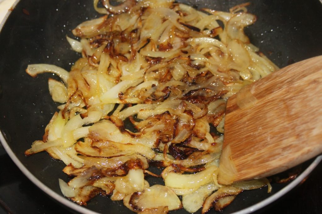 - L’oignon se colore et perd son eau au fur et à mesure.