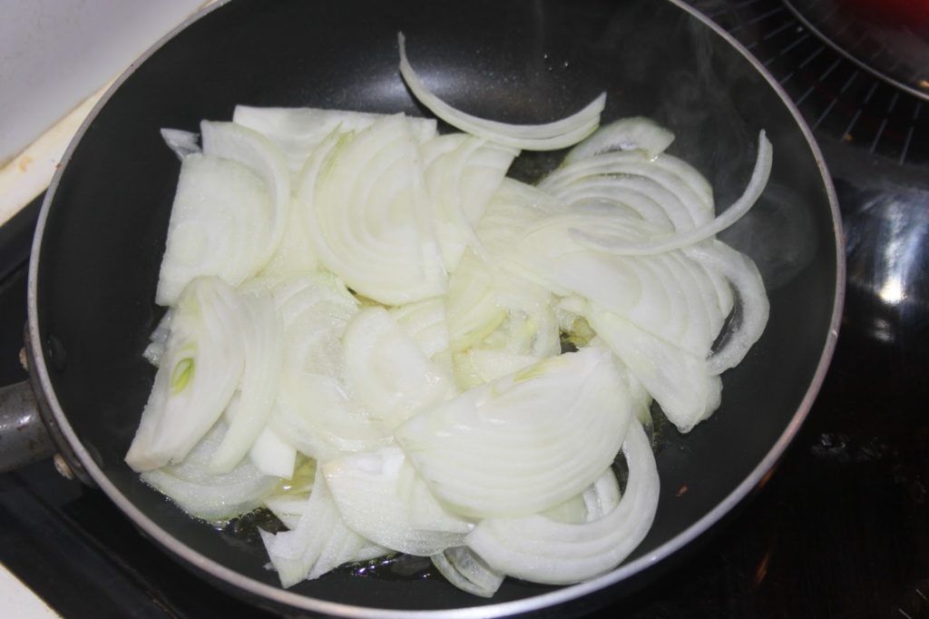 - Mettre deux cuillerées à soupe d’huile d’olive dans une petite poêle sur feu modéré. Ajouter l’oignon.