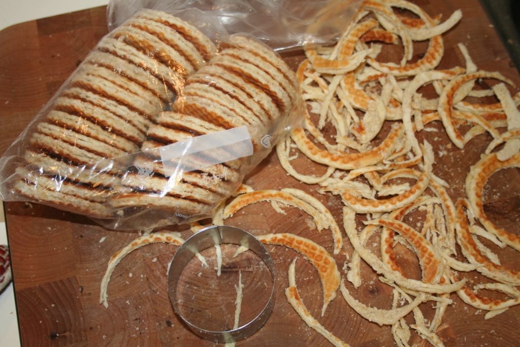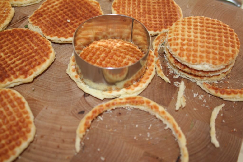 Avec un cercle à pâtisserie ou un emporte pièce, couper le bord des gaufrettes pour obtenir une gaufre parfaitement uniforme. On peut aussi ne pas passer par cette opération. Cela n’a qu’un but visuel.