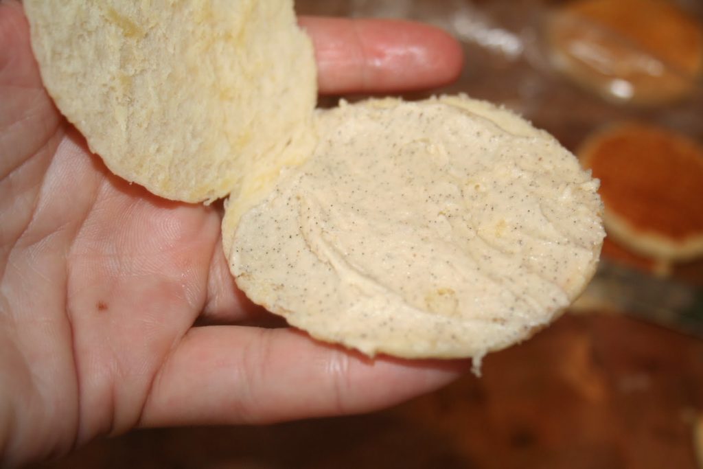 - Ouvrir le sachet quand les gaufres ont refroidi et mettre une grosse noix de fourrage à l’intérieur de chaque gaufrette. Ne pas hésiter à en mettre une vraie bonne couche, car si elle est trop fine, on ne sentira pas grand chose!!