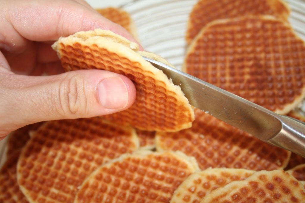 - Dès la sortie du gaufrier, couper les gaufrettes dans l’épaisseur.