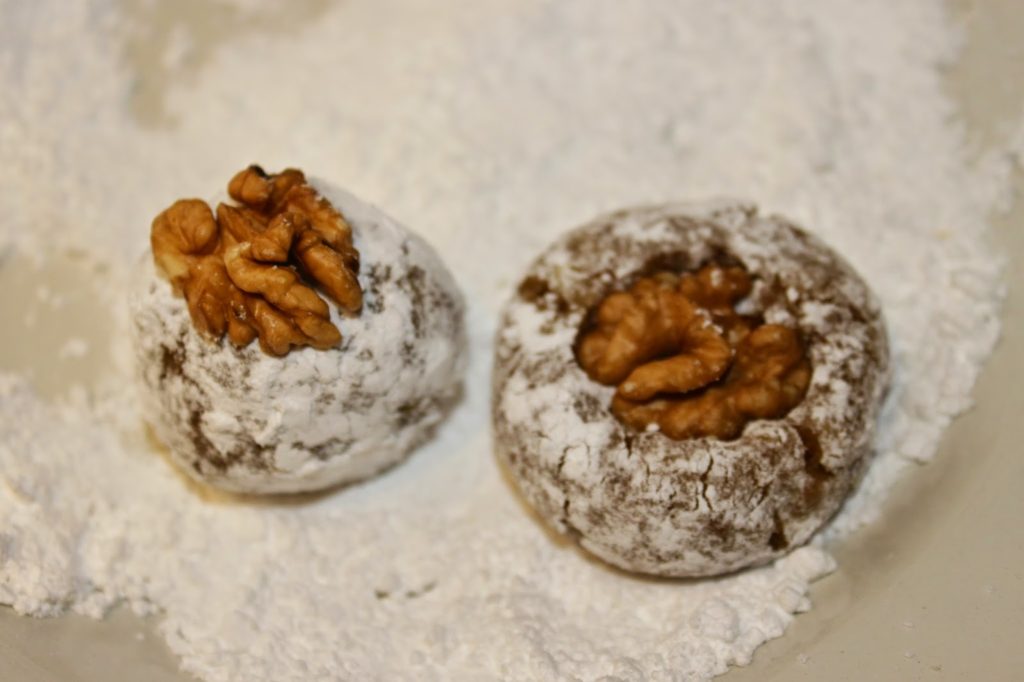 - Placez un cerneau de noix par boulette en l’enfonçant délicatement jusqu’à ce que la pâte craque légèrement.