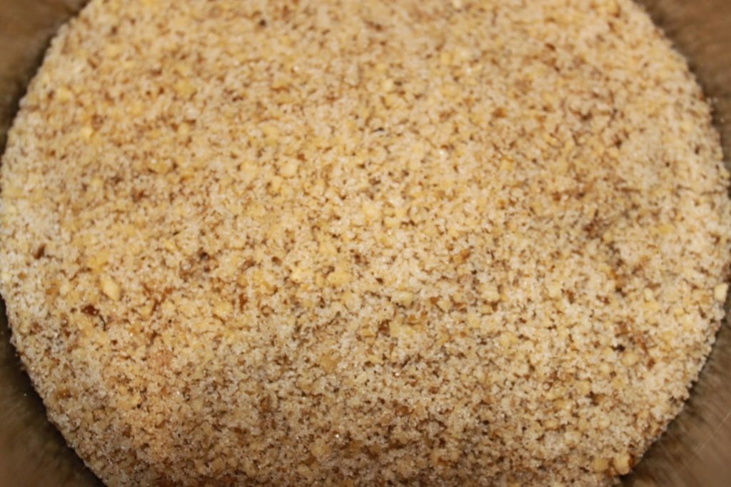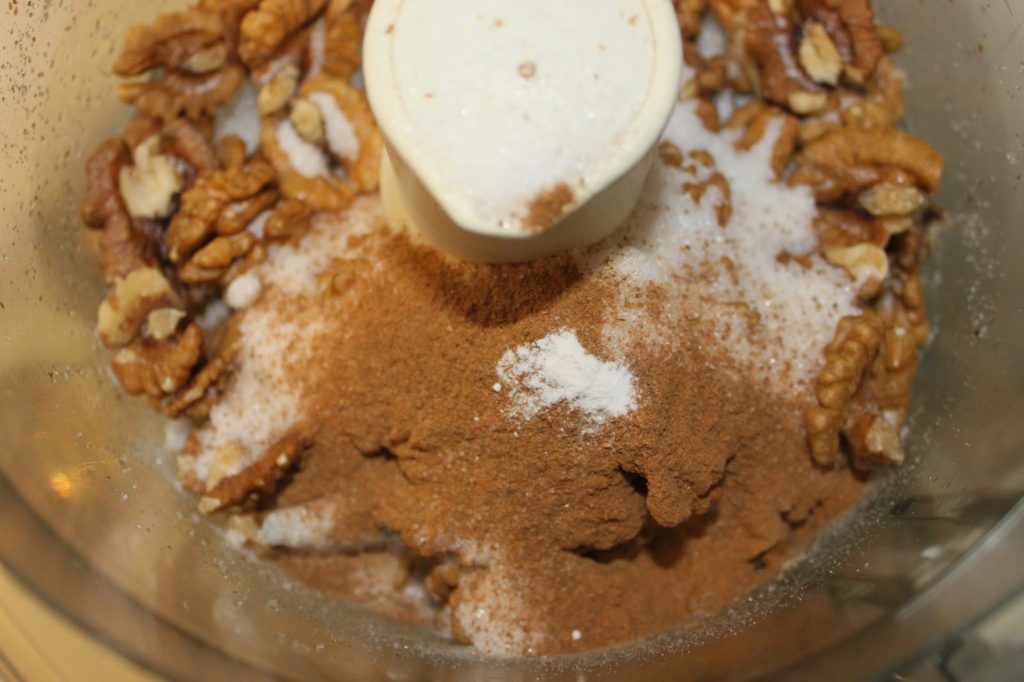 - Placez le sucre, les noix (les 180g), la cannelle et la levure chimique dans le bol d’un mixeur.