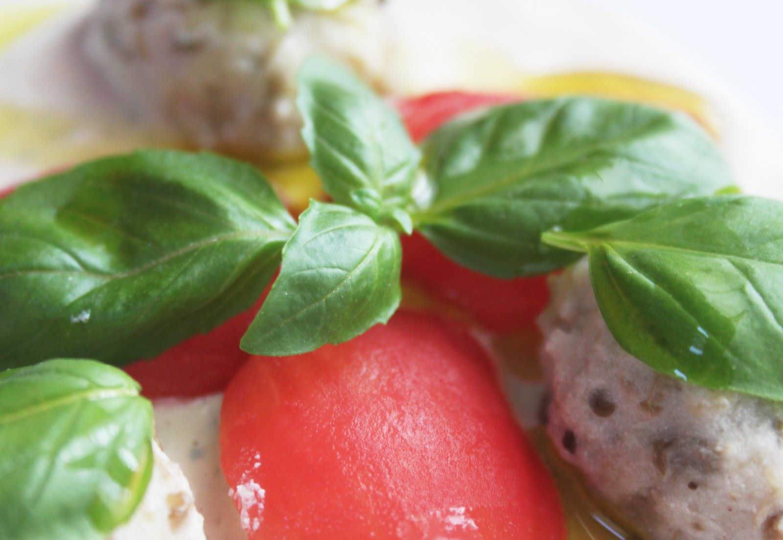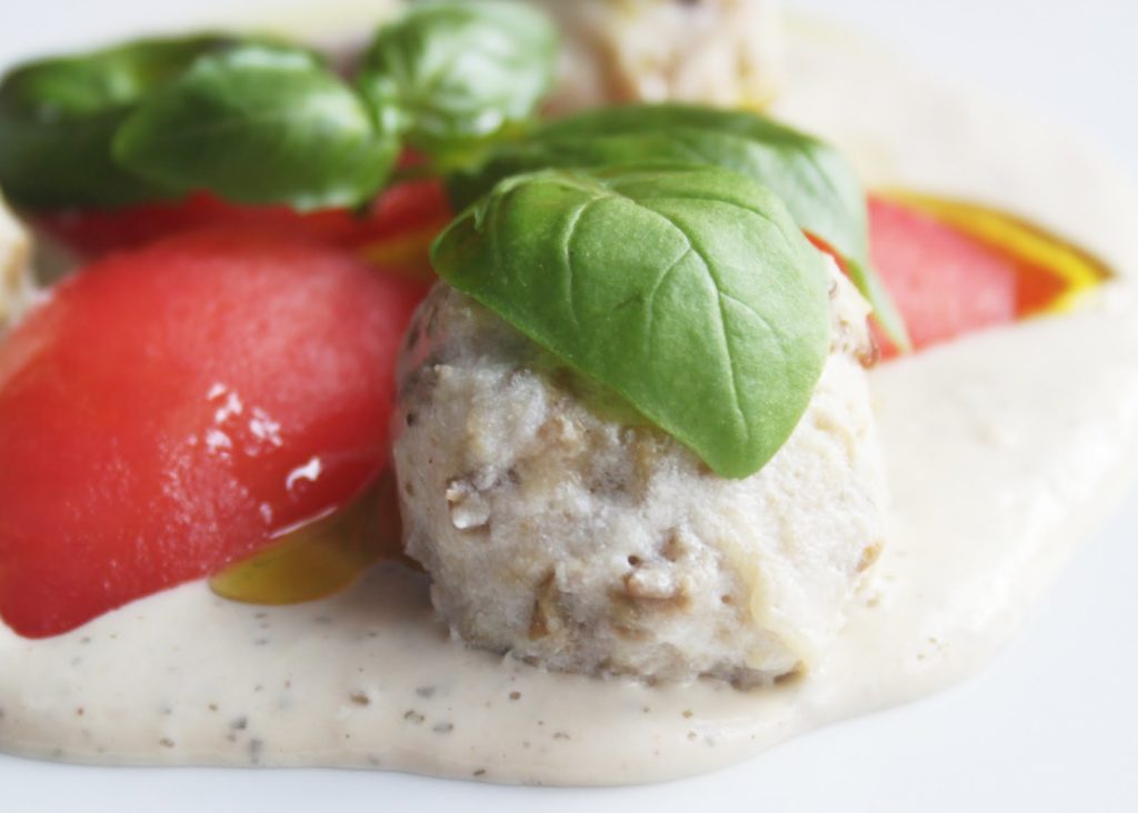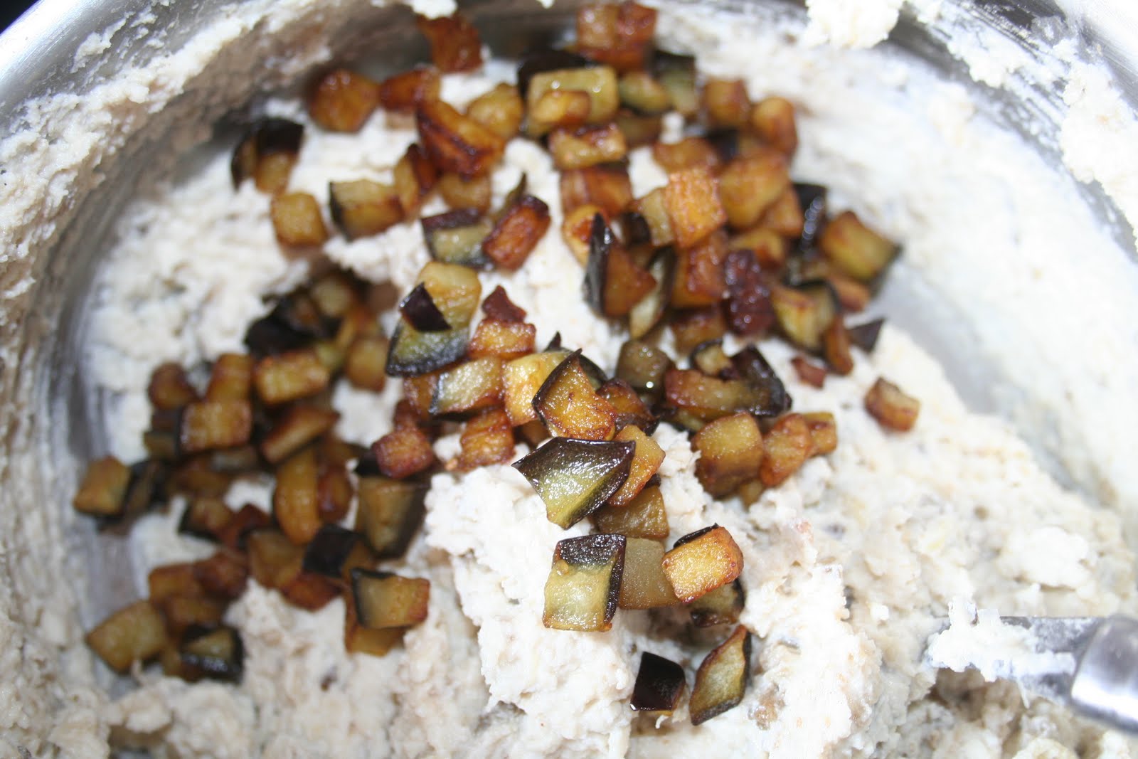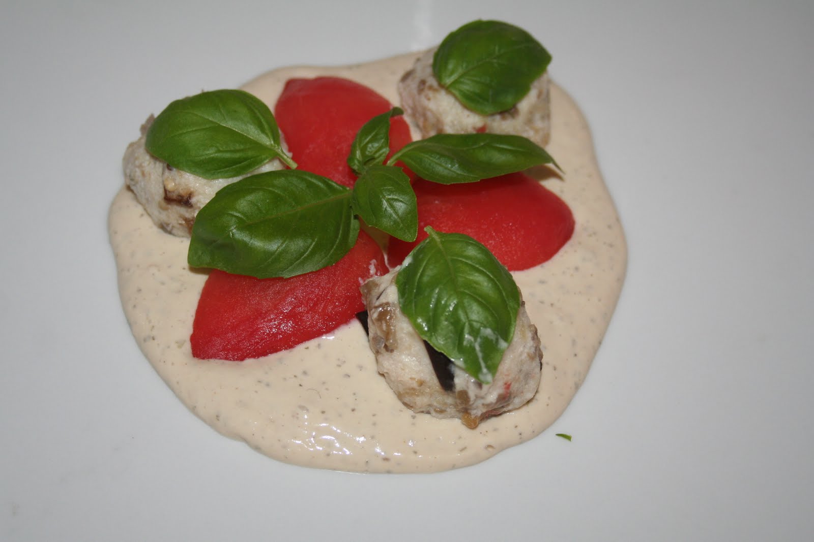 -5 tomates -feuilles de basilic frais -300g de tahina tout prêt (ou voir recette plus bas) -huile d’olive Gnocchis: -320g de ricotta (bien enlever le jus, ne peser que la ricotta) -80g de parmesan frais râpé -40g de maïzena -noix de muscade -poivre -200g d’aubergines rôties (voir plus bas!) -150g d’aubergine en cubes frits (voir encore et toujours plus bas!)