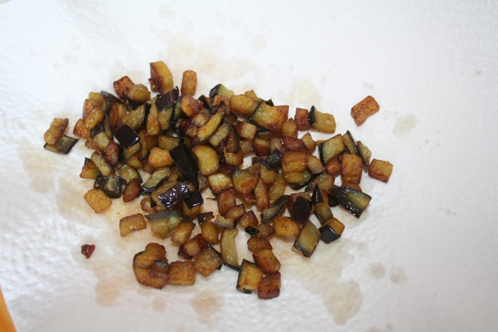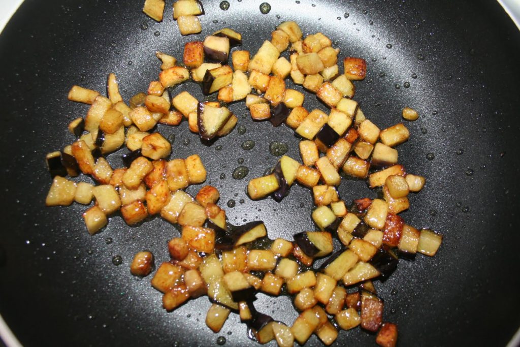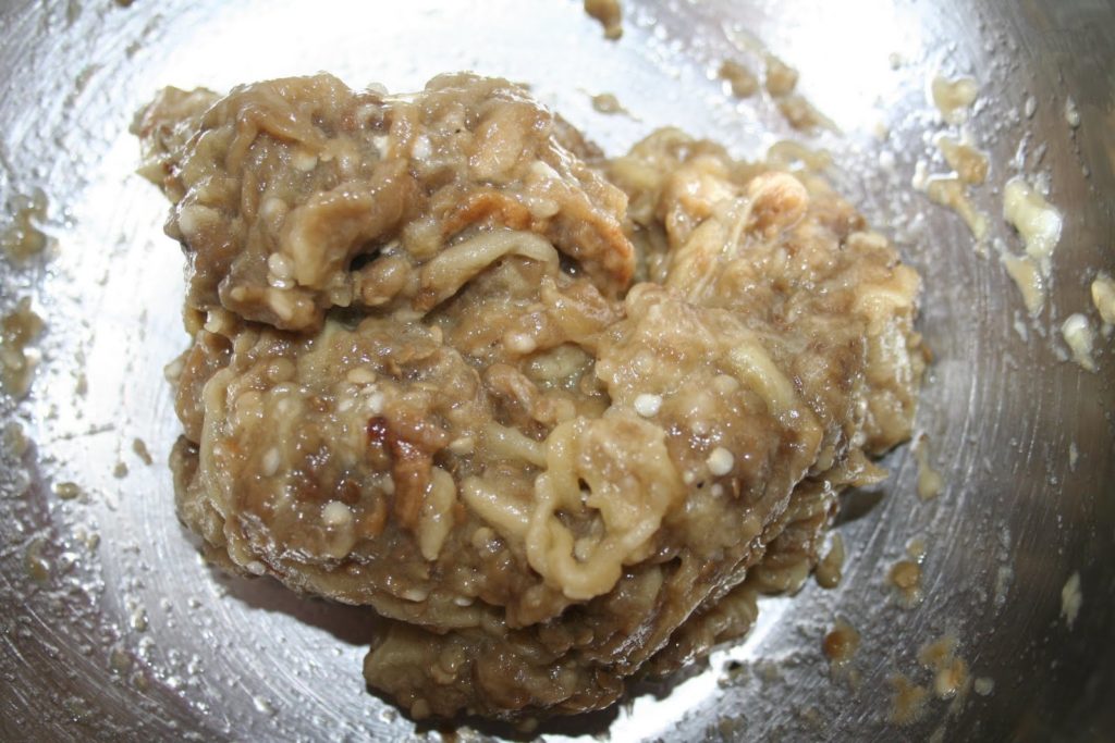 Écraser le tout à la fourchette et peser 200g de cette purée d’aubergines.