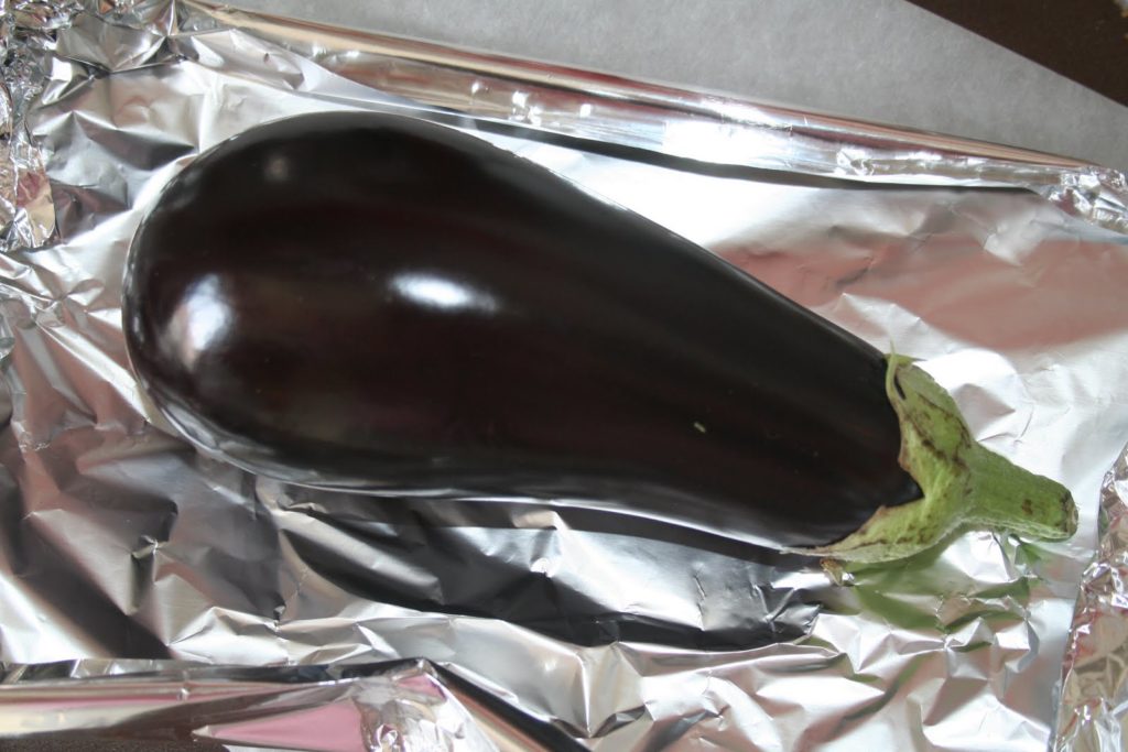 Commencer par mettre au four une (une grosse!) ou deux aubergines. Il suffit de placer la ou les aubergines sur une plaque allant au four, en les plaçant sur un papier d’aluminium, pour protéger le plat.