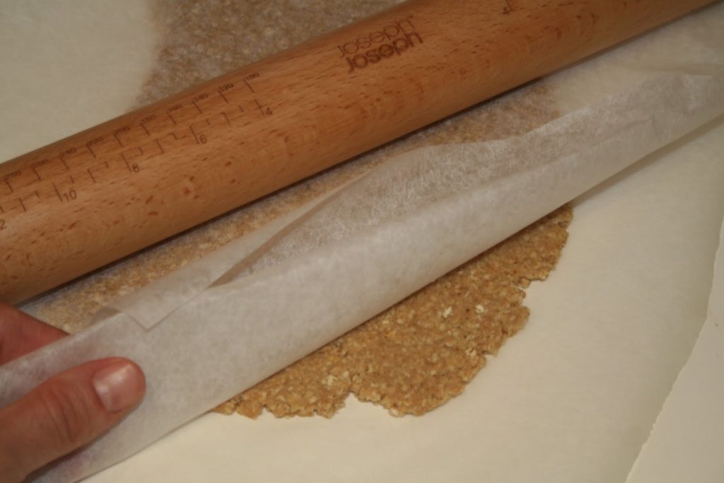 Mettre cette boule sur un papier sulfurisé, l’écraser avec la paume de la main. Mettre un deuxième morceau de papier sulfurisé sur la pâte et l’étaler au rouleau sur une épaisseur de 5 millimètres. Avec cette méthode des deux papiers, tout reste propre, y compris le rouleau à pâtisserie!