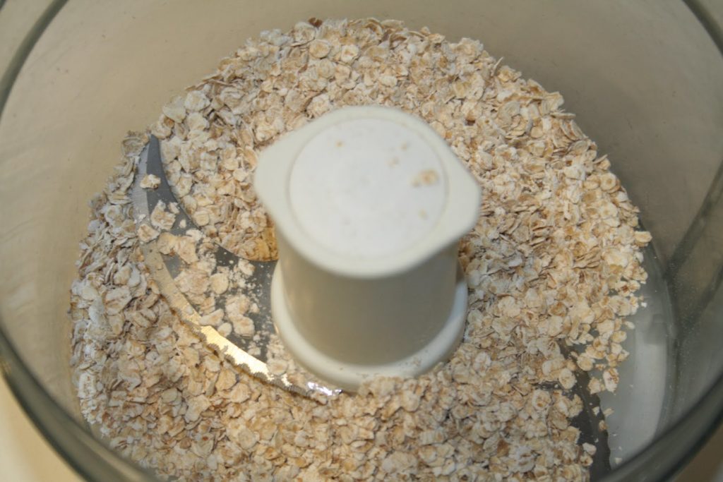 Commencer par réduire les flocons d’avoine en poudre très grossière. Il faut pour cela, juste les passer quelques secondes au mixeur.