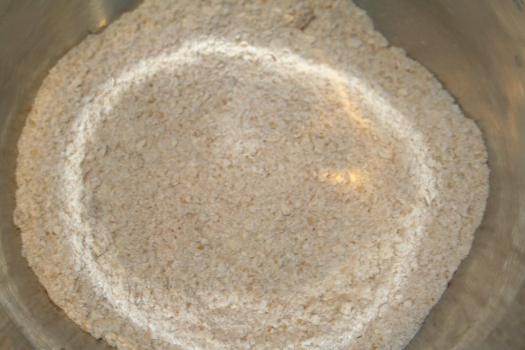 - Mettre dans une jatte, tous les ingrédients secs. La farine blanche et la farine complète, la poudre d’avoine, le sucre roux et la vergeoise blonde, la levure et le bicarbonate.