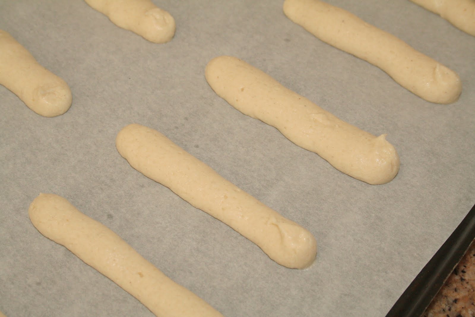 - Je préfère utiliser une poche à douille pour être sûr d’avoir des langues de chat plus régulière. Avec une douille n°9, tracer des traits de pâte de 6 cm de long. Bien espacer car les langues s’étalent!