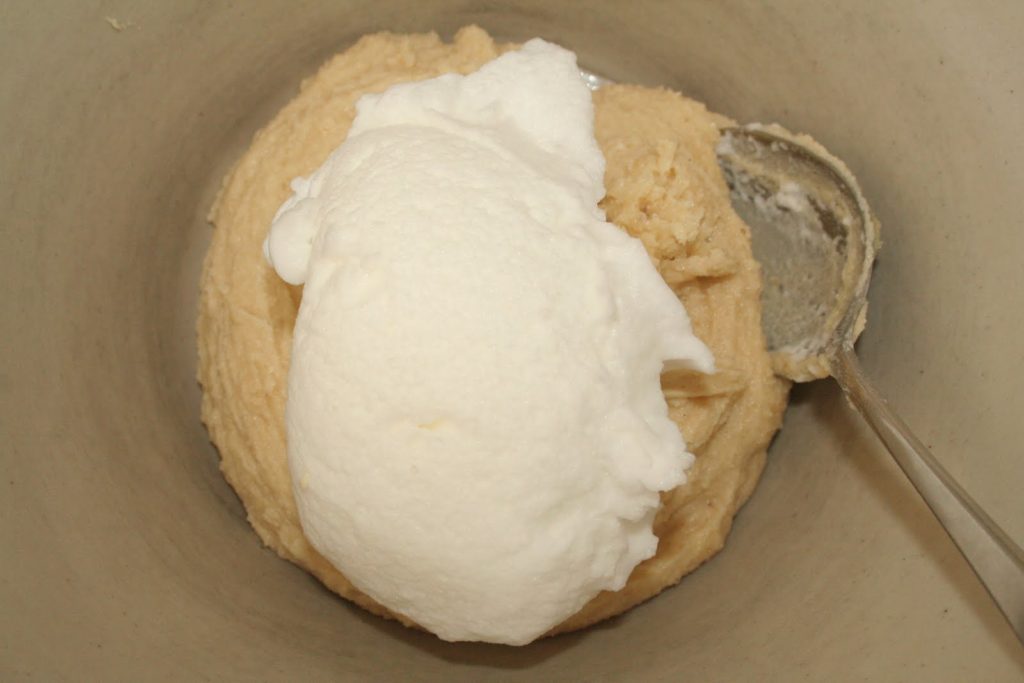 - Monter les blancs en neige ferme puis les ajouter au mélange précédent en soulevant bien pour ne pas faire retomber les blancs.