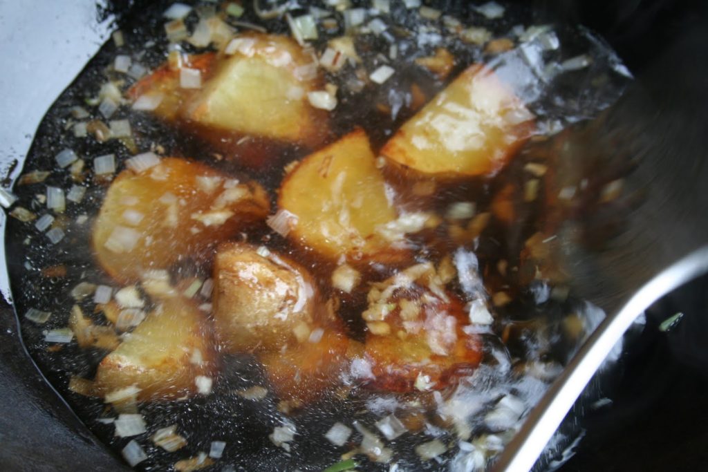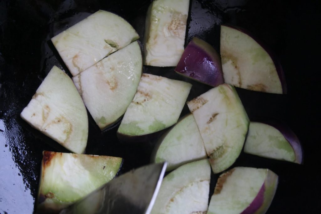 Les légumes braisés sont dans cette recette, la pomme de terre, l’aubergine et le poivron vert. Cuits une première fois séparéments, ils sont ensuite braisés dans un wok.