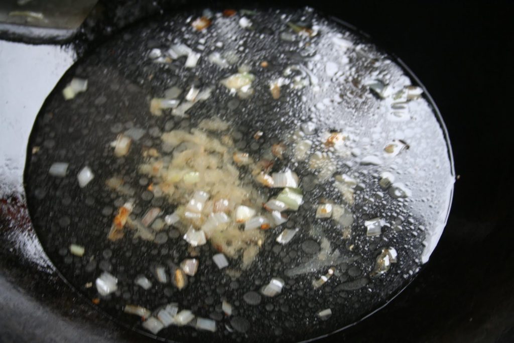 - Dans le wok vide, sur feu modéré, ajouter 2 cuillerées à soupe d’huile, l’ail et la ciboule. Cuire pour faire dorer légérement.