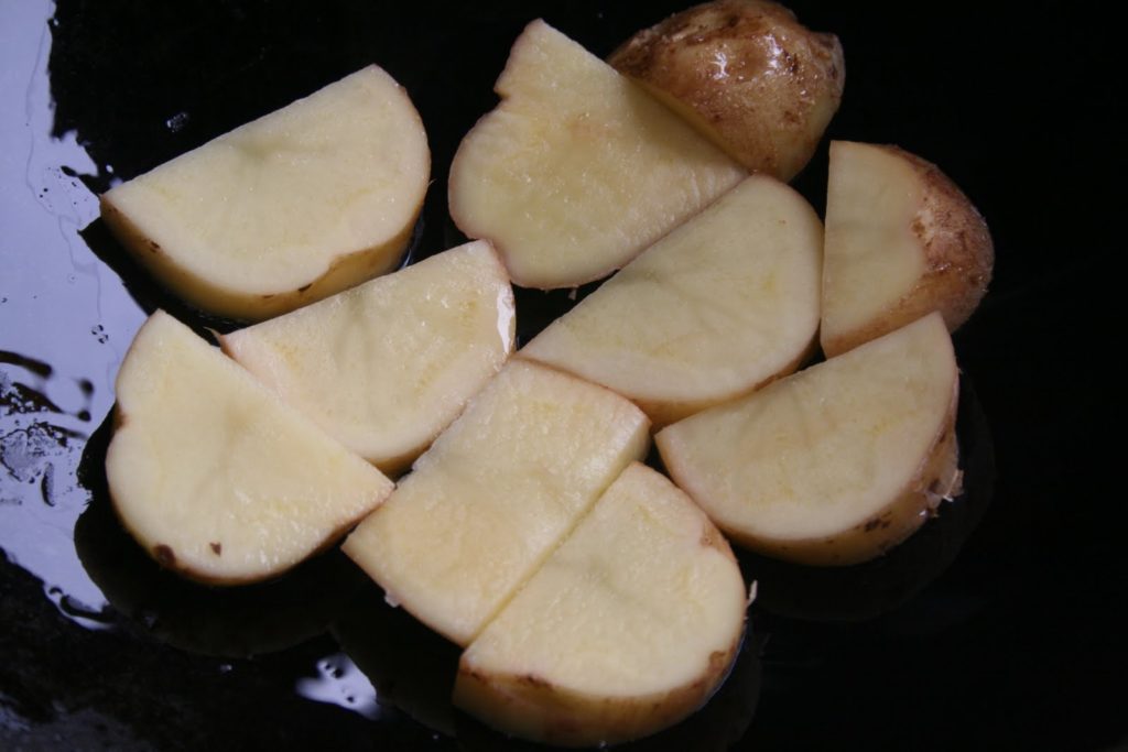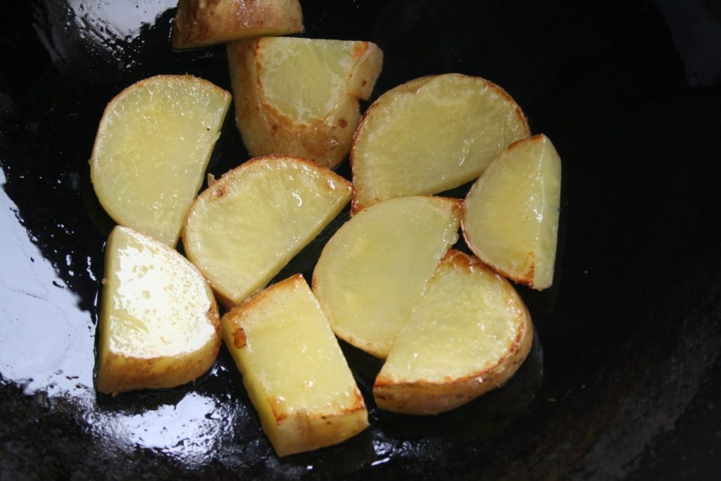 - Bien laver les légumes. Couper les pommes de terre (avec la peau ou sans). Sur feu modéré, chauffer le wok avec 2 cuillerées à soupe d’huile. Ajouter les pommes de terre et les cuire d’un côté jusqu’à ce qu’elles soient colorées.