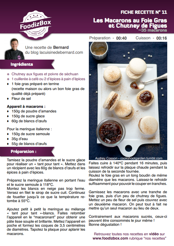 - Garnissez les macarons avec une tranche de foie gras, puis d'un peu de chutney de figues. Mettez un peu de fleur de sel puis couvrez avec un deuxième macaron. On peut tout à fait ne mettre qu'un seul macaron au lieu de deux.