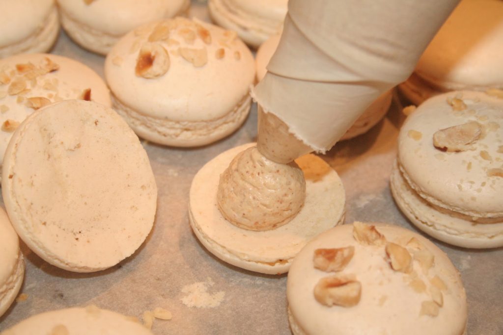 - Garnir les coques de macarons, et les coller deux à deux avec l’une des coques qui aura des noisettes.