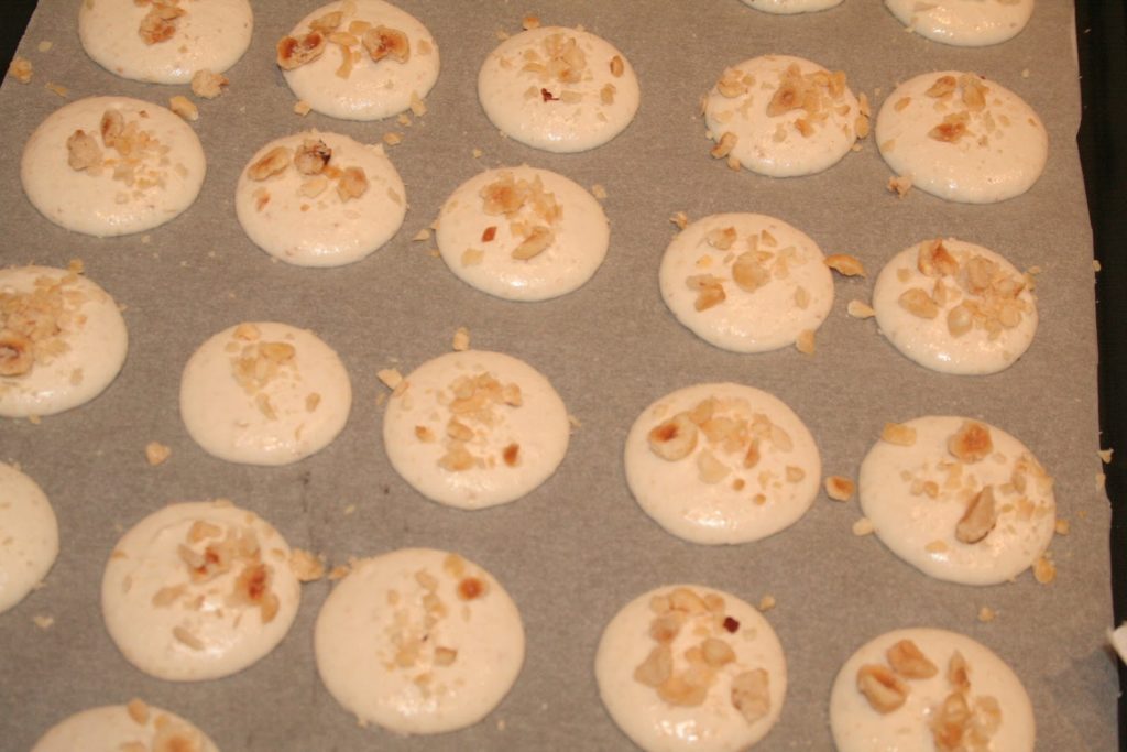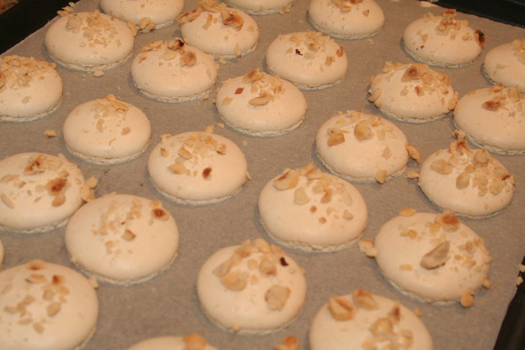 - Parsemer la moitié des macarons avec des noisettes.