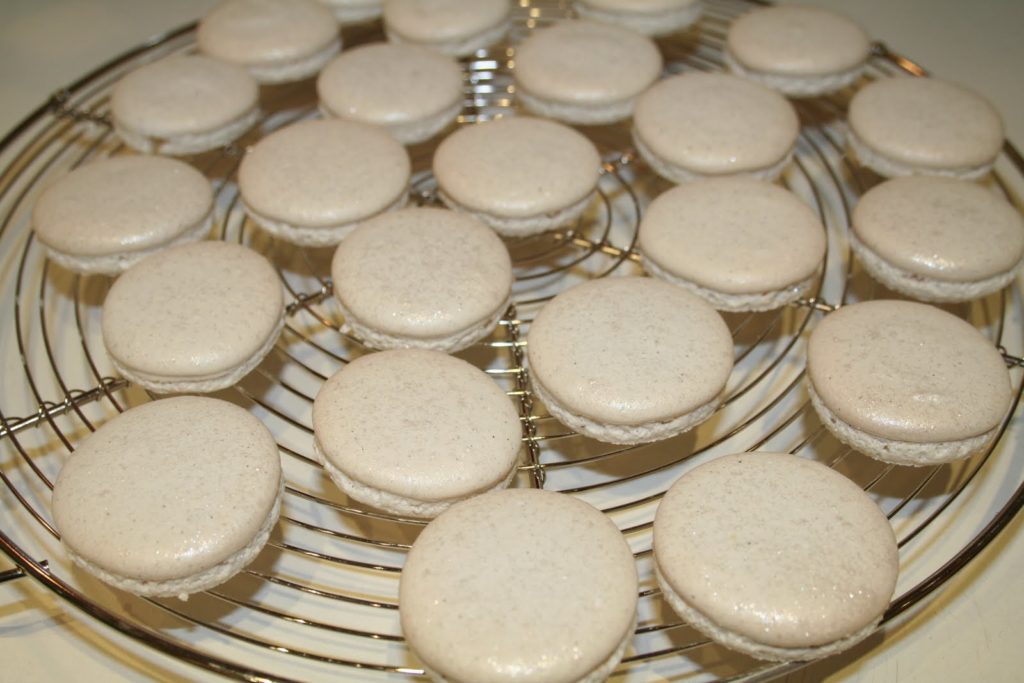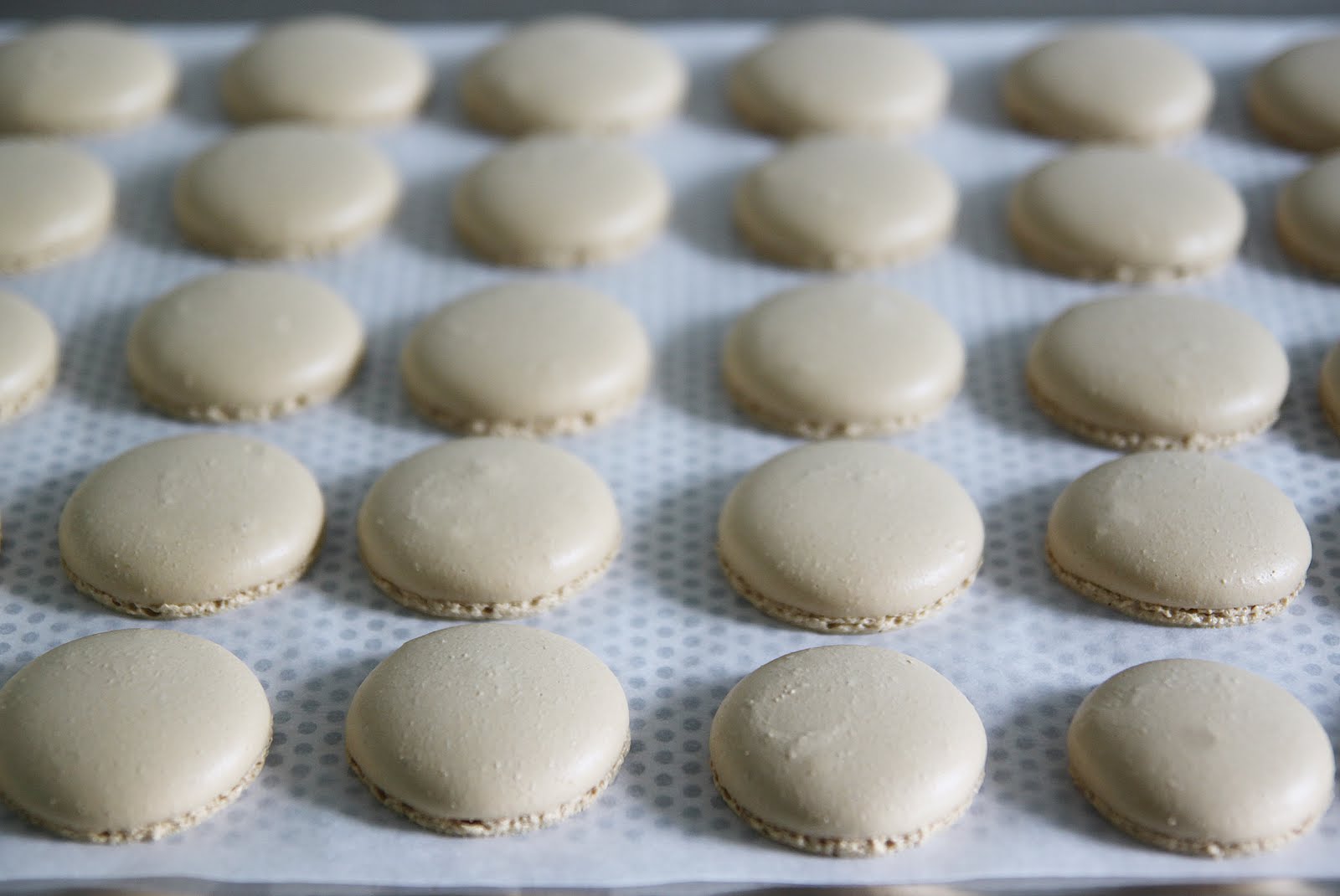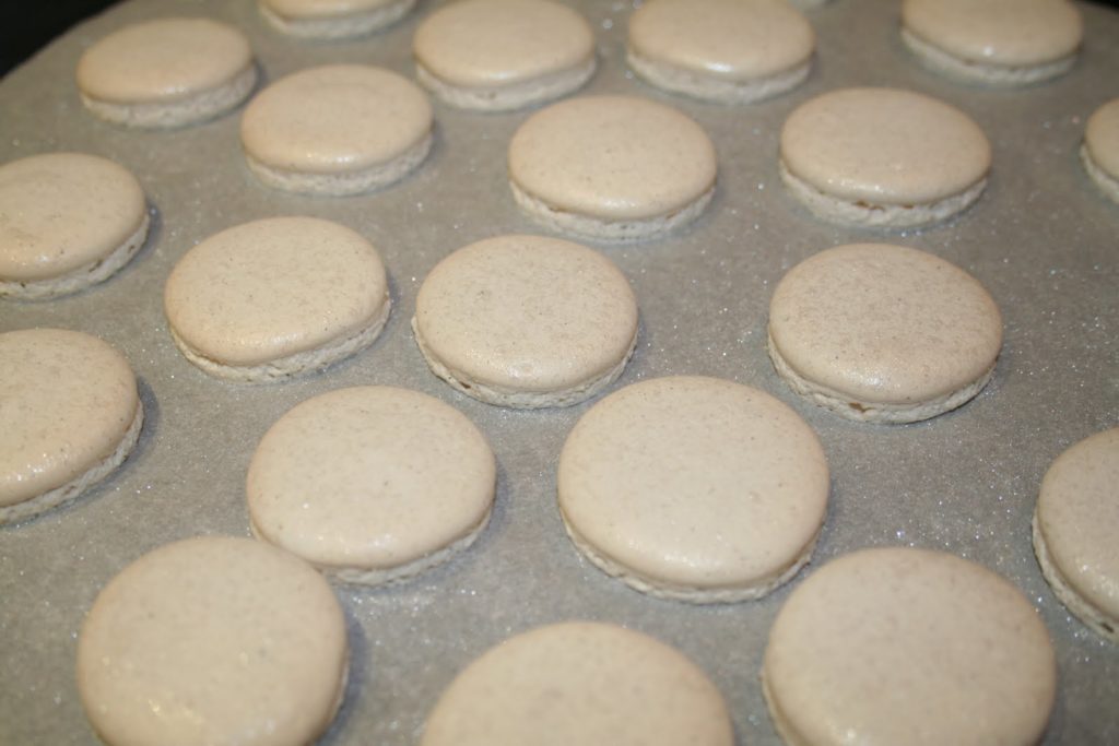 - Préchauffer le four à 140°C. Placer uen grille au milieu du four. Quand celui-ci est chaud, placer une plaque de macarons sur la grille et laisser cuire 16 minutes selon la puissance du four.Conseil de Bernard:dans les livres il est souvent demandé de superposer les plaques, c’est à dire de mettre la plaque avec les macarons avant cuisson sur deux autres plaques identiques. J’ai essayé avec et sans. Verdict: c’est PAREIL!!!! Ca ne change rien et je préfère même sans ces fameuses plaques en dessous car les macarons ne cuisent pas en dessous et pour les décoller c’est un cauchemar! Et mes macarons ONT la colerette, leur pied si particulier! Et non mes macarons ne sont pas trop cuits! Ils ont tout leur moelleux après une nuit ou deux passées au frais. A bon entendeur…