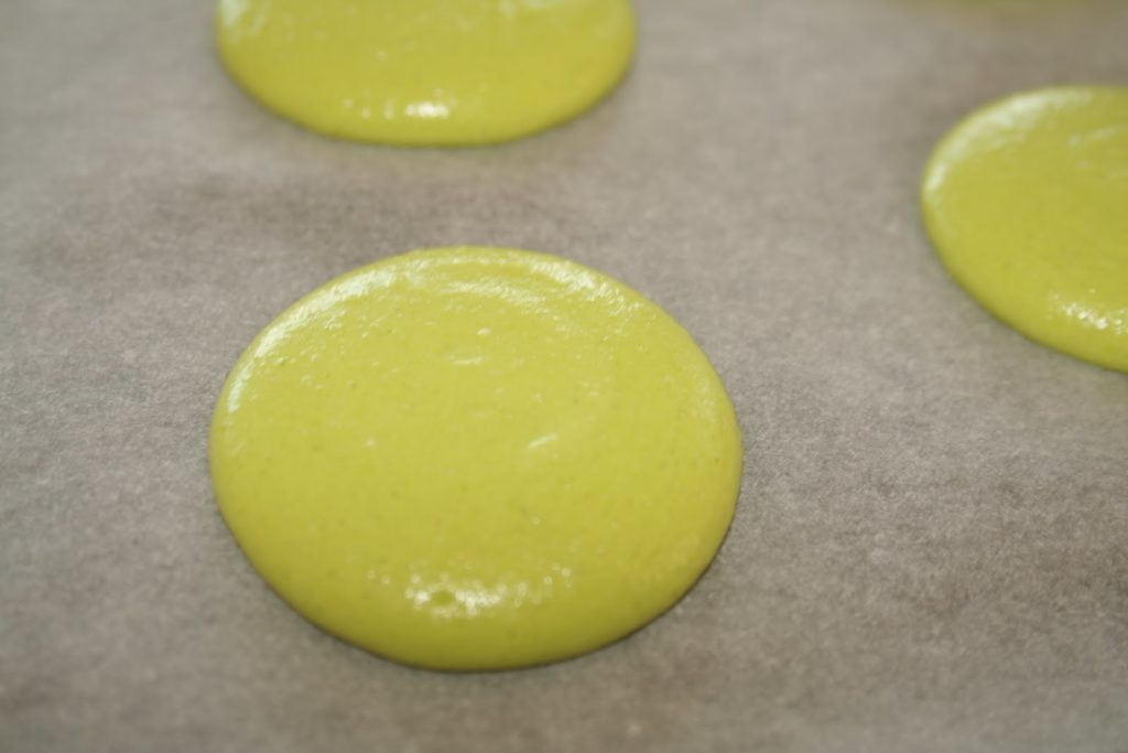 Le macaron va ensuite s’étaler un tout peu si la pâte a été correctement réalisée. On peut tapoter légérement la plaque sur la table pour forcer la pâte à s’étaler et à perdre les imperfections dûes à la poche à douille ou à une mauvaise manipulation.