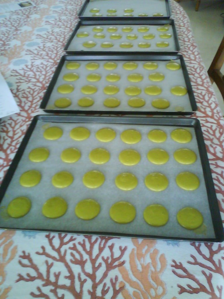 Conseil de Bernard:dans les livres il est souvent demandé de superposer les plaques, c’est à dire de mettre la plaque avec les macarons avant cuisson sur deux autres plaques identiques. J’ai essayé avec et sans. Verdict: c’est PAREIL!!!! Ca ne change rien et je préfère même sans ces fameuses plaques en dessous car les macarons ne cuisent pas en dessous et pour les décoller c’est un cauchemar! Et mes macarons ONT la colerette, leur pied si particulier! Et non mes macarons ne sont pas trop cuits! Ils ont tout leur moelleux après une nuit ou deux passées au frais. A bon entendeur…